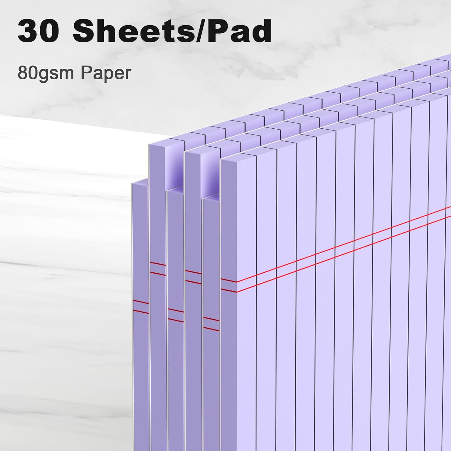 - Purple colored Legal Pads 8.5 x 11 Inch are perfect for students, teachers, and professionals. Made with premium 80gsm thick paper, these notepads provide a luxurious writing experience. The colored paper resists ink bleeding, while the black lines and double red margin lines offer ample space for your notes.