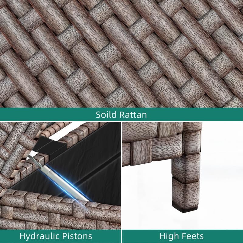 - All-weather deck box: Crafted from weather-proof rattan, this outdoor waterproof 260 gallon deck box is built to brave the elements. Water-repellent and sun-proof, it promises years of reliable use. The robust hydraulic pistons allow for smooth, effortless lifting