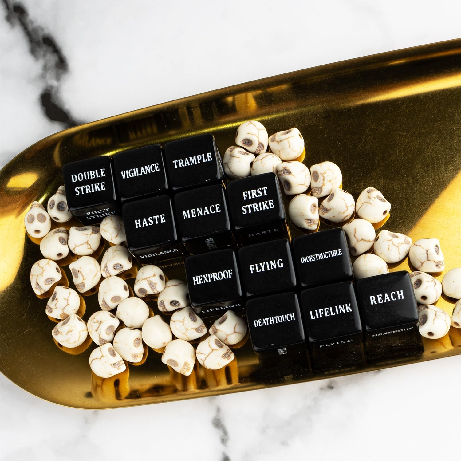 - Package Include: Total 24pcs black MTG keywords dice(FIRST STRIKE,VIGILANCE,MENACE,TRAMPLE,HASTE,DOUBLE STRIKE / LIFELINK,REACH,FLYING,HEXPROOF,DEATHTOUCH,INDESTRUCTIBLE) and 24pcs dice counters(12 pieces -1~-6 counters & 12 pieces +1~+6 counters) with velvet pouch.