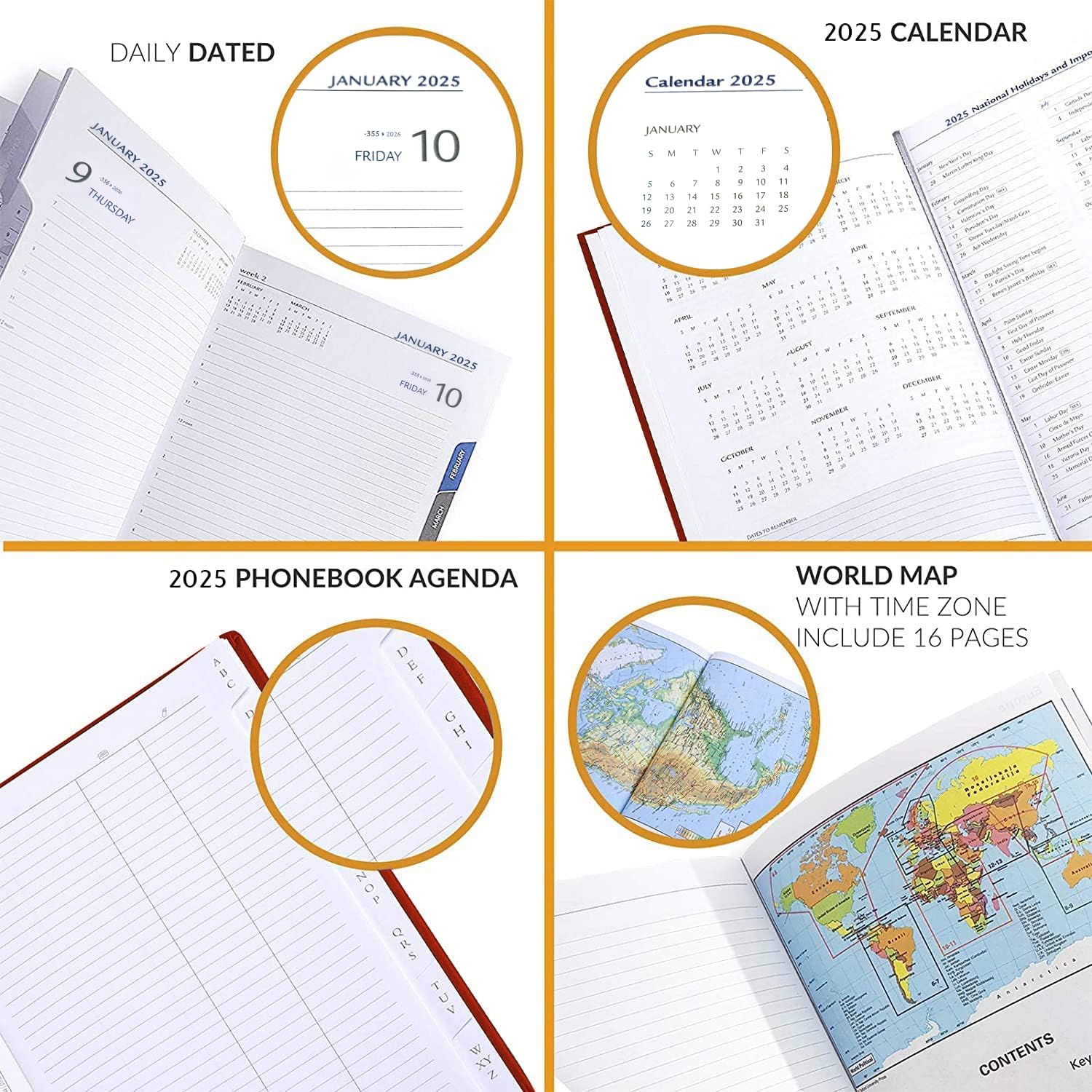 - 5 x 7 in Size with Monthly Tabs. 2026 yearly calendar, international holidays, world time zones and contacts pages for quick reference;
