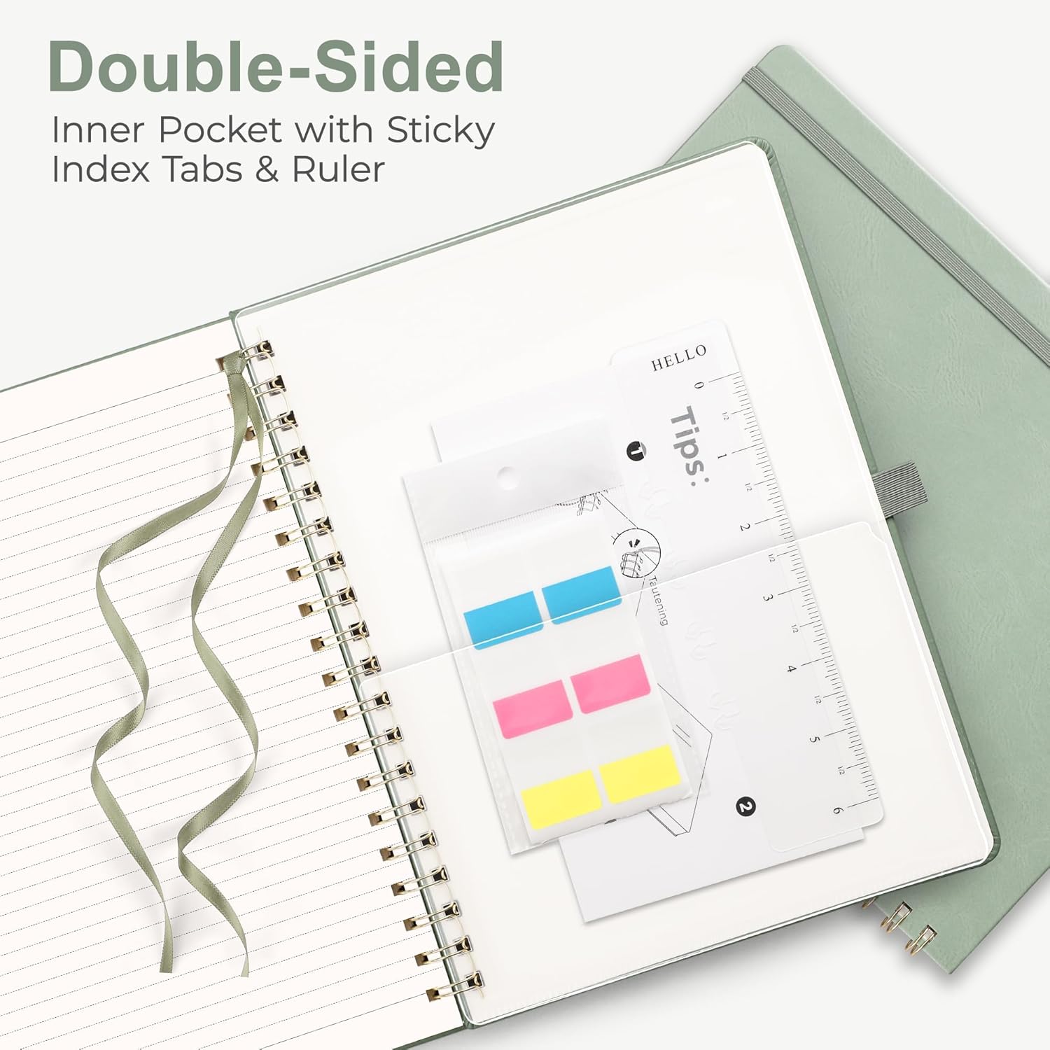 - SPIRAL NOTEBOOK: RETTACY Spiral Notebook comes in a A4 (8.5'' Γ 11'') size, 110 Numbered Pages, Leather Hardcover, Sturdy Twin-wire Spiral Bound, 7 mm college ruled writing space, 100 GSM Paper, Pen Holder, Elastic Closure Bands, Inner Pocket, Ribbon Bookmark, Lightweight Ruler, Sticky Index Tabs