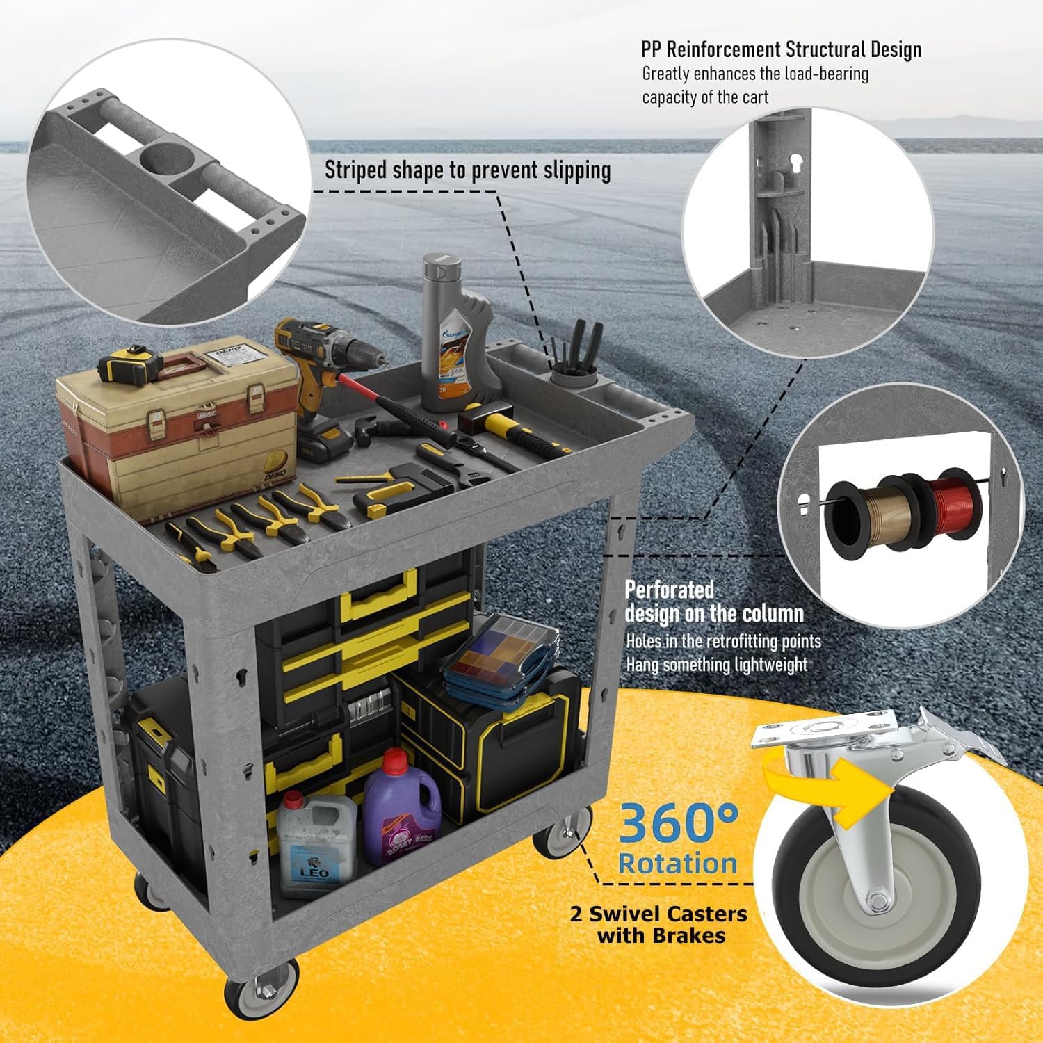 Service Utility Plastic Tool Cart, 34 x 17-Inch Rolling Cart with Deep 2-Shelf Heavy Duty Wheels, 550 lbs Capacity Organizer for Garage, Warehouse, Workshop