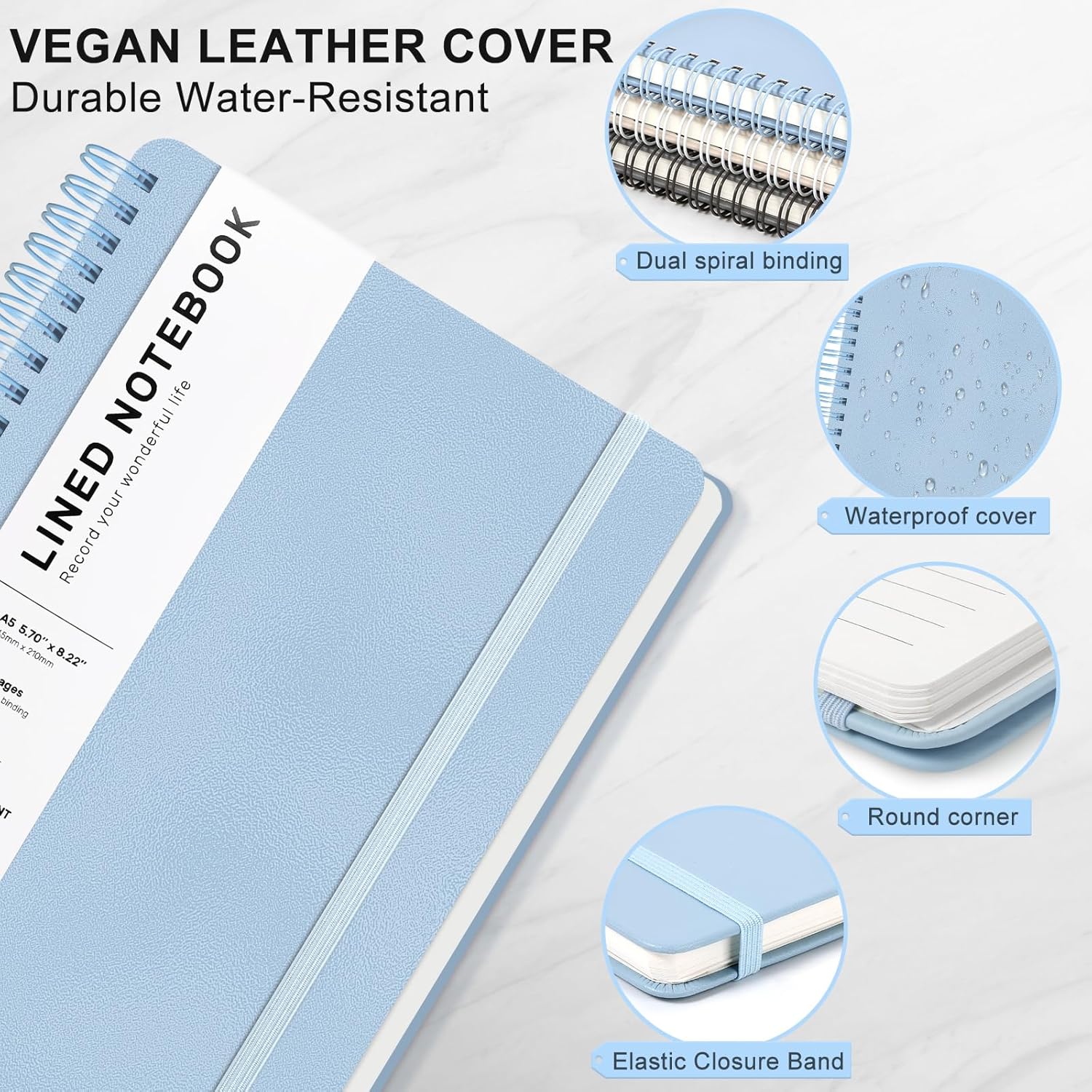 Lined Spiral Journal Notebook, A5 Hardcover Leather Notebook for Work, 5.7''×8.2'', 100GSM Thick Paper Spiral Bound Journaling Notebook for Women Men Office School Note Taking Business, Morandi Blue