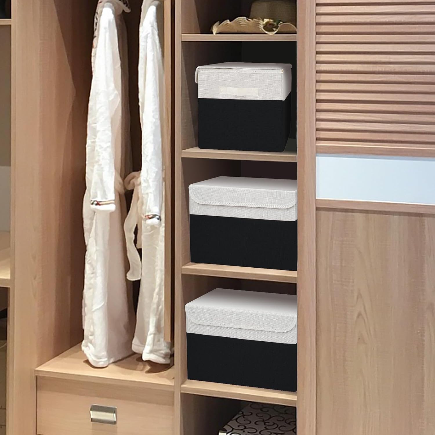 Large 17" 42 Quarts Collapsible Stackable Storage Bins with Lids [3-Pack] Foldable Fabric Linen Storage Boxes Cube, Closet Organizer Baskets with Label for Home (16.7 x 12 x 12", Black & White)