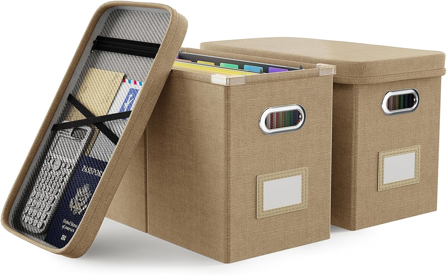 Oterri Hanging Filing File Box with Mesh Pocket, File Organizer Box with Lid, Collapsible Document Organizer Box for Letter Size, Easy Slide Durable Storage Box for Office/Decor/Home (2 PCS, Khaki)