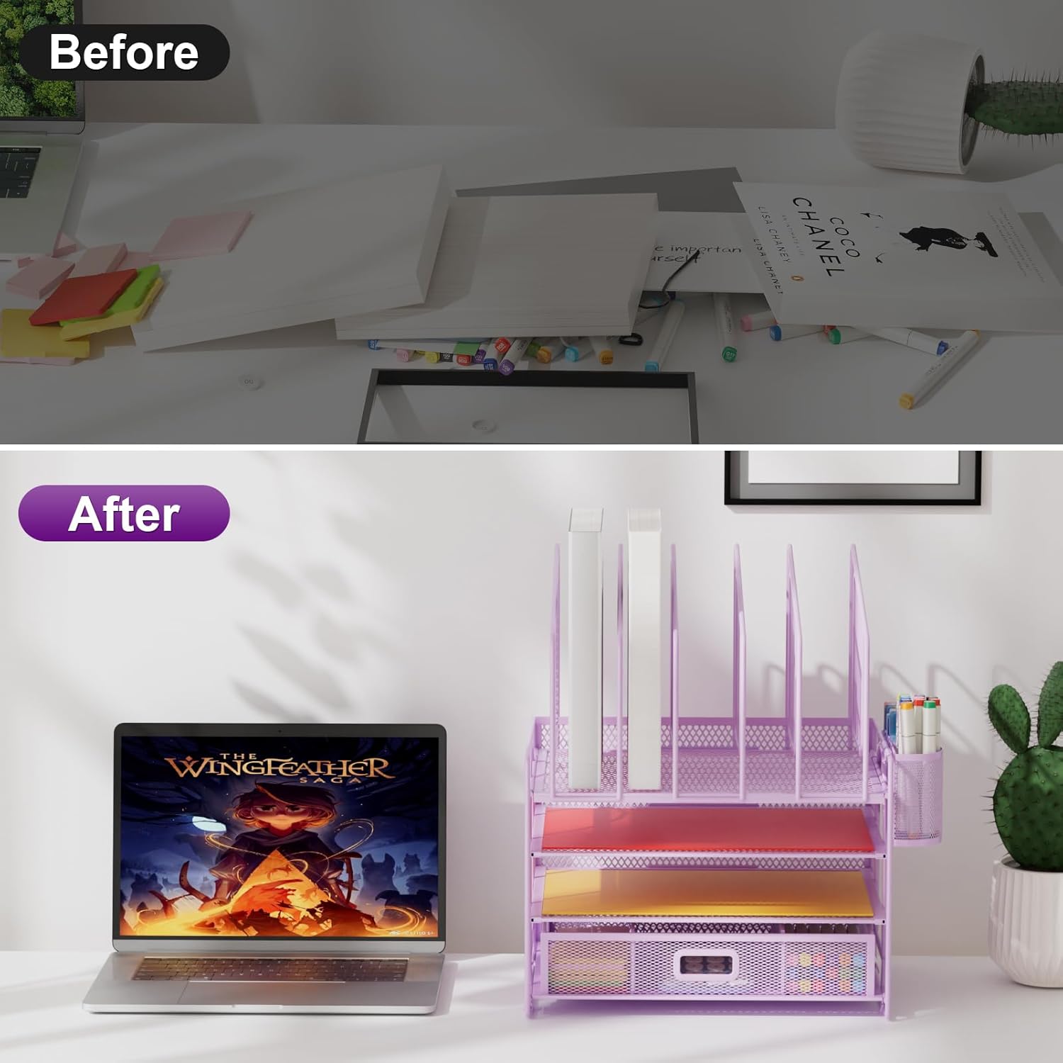 Marbrasse Desk Organizers, 4-Tier Mesh Desk File Organizer with 5 Vertical File Holders and 2 Pen Holders, Multifunction Desktop Organizer,Desk Organizers and Accessories for Home Office (Purple)
