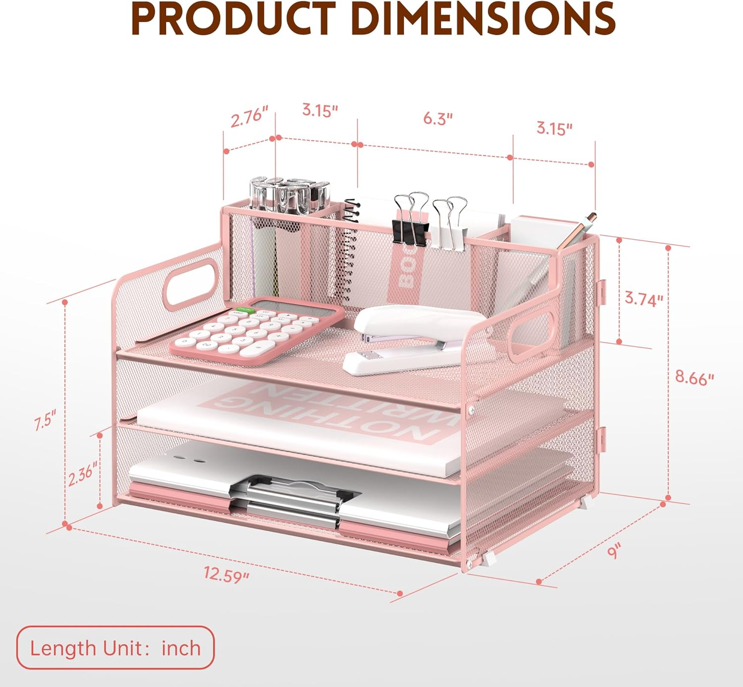 SUPEASY 3 Tier Desk Organizer with Handle & 3 Pen Holders, Mesh Paper/File Organizer for Desk, Paper Letter Tray Organizer for Office Supplies (Cute Pink)