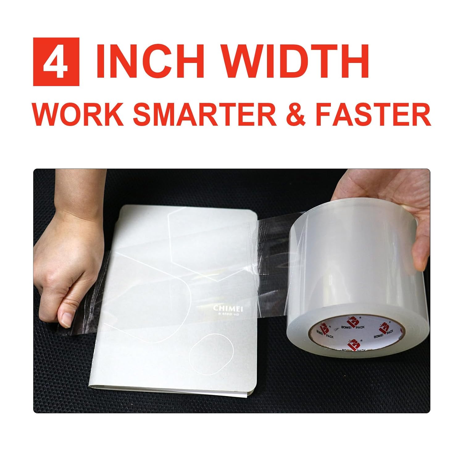 - EXCLUSIVE SIZES: We offer unique tape sizes 4 inch x 110 Yards (330ft). The wider dimensions of our tape save you time and money, enabling you to work faster and smarter. It will help your warehouse manage the sealing process quick and efficient. Adhesive sticks to smooth and textured surfaces especially on cardboard and carton materials