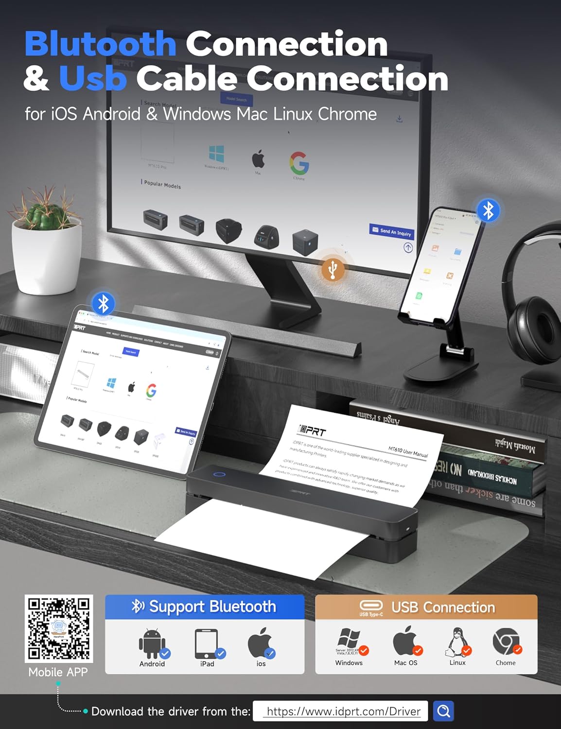 - âś…COMPUTER-DRIVEN PRINT:Step 1: Connect the MT610 Pro to your computer using a USB-C cable and power it on. Step 2: Download the appropriate driver for your computer's operating system from the brand's official website and install it. Step 3: Load thermal paper into the MT610 printer. On your PC, select the file, set the corresponding paper size, and start printing.