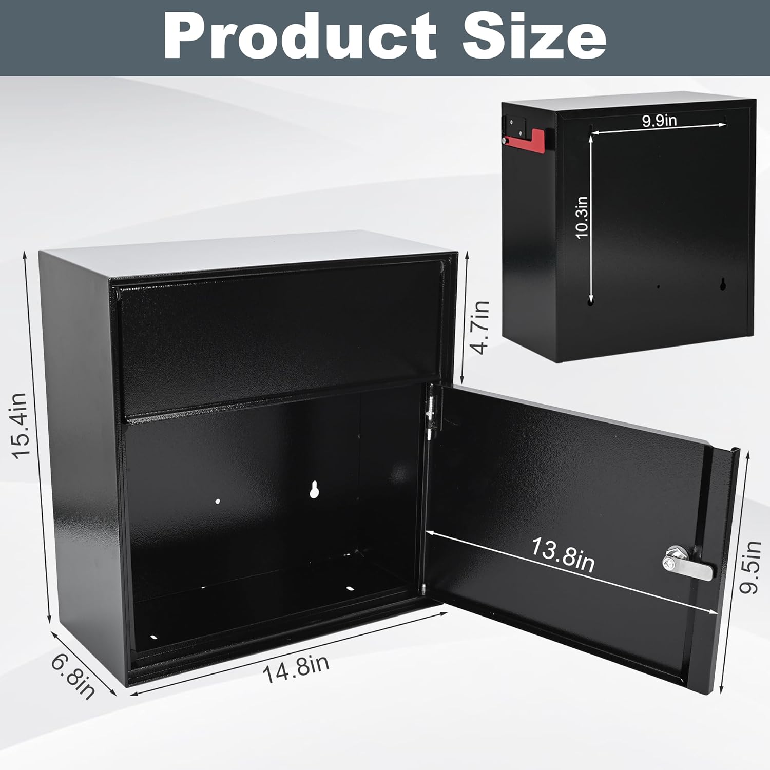 Large Wall Mount Mailbox with Lock and Outgoing Mail Flag for Outside, Steel Locking Security Mail Box with Number Stickers for House Outside, 14.8" x 6.9" x 15.4", Rainproof, Black