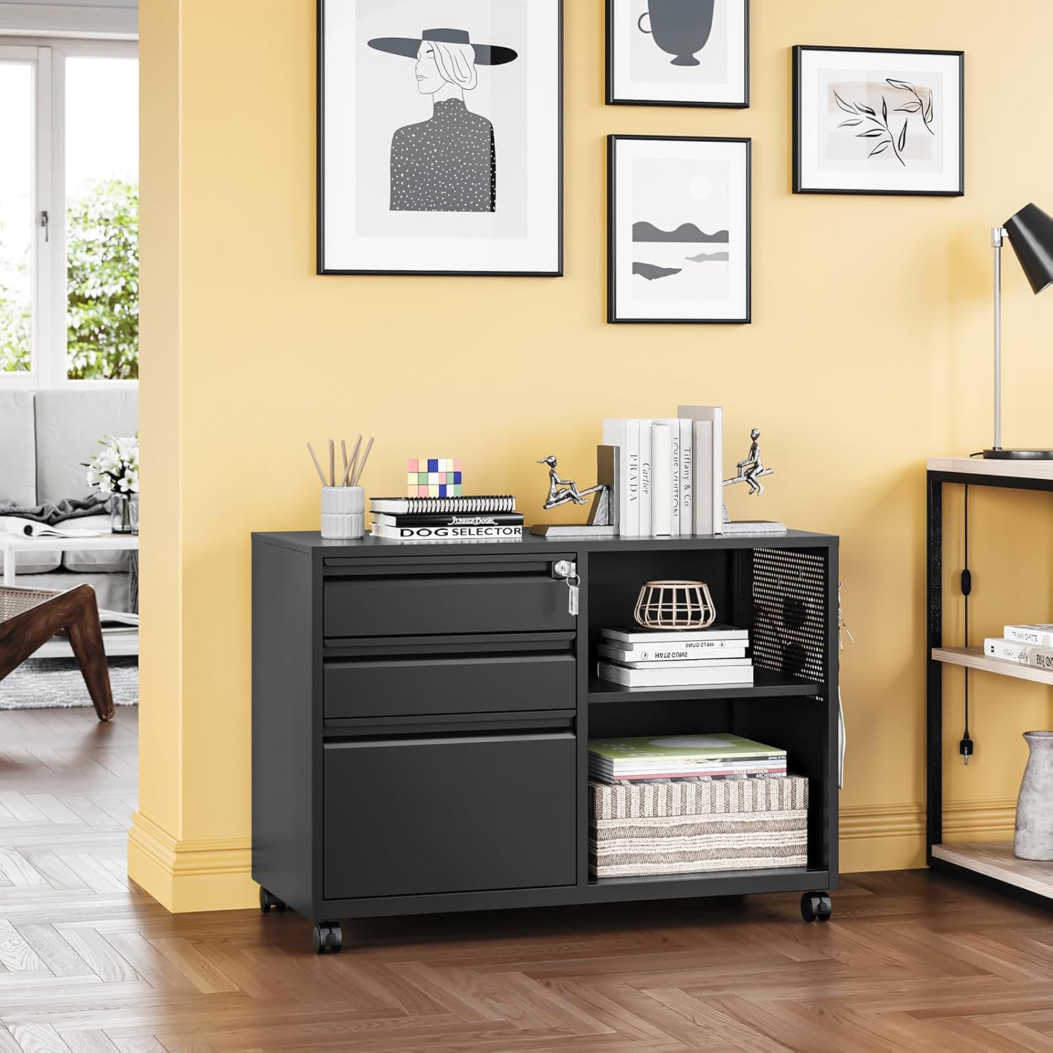 3 Drawer Metal File Cabinet with Lock,Mobile Lateral Filing Cabinet,Printer Stand Storage Cabinets with Shelves for Home Office(Black)