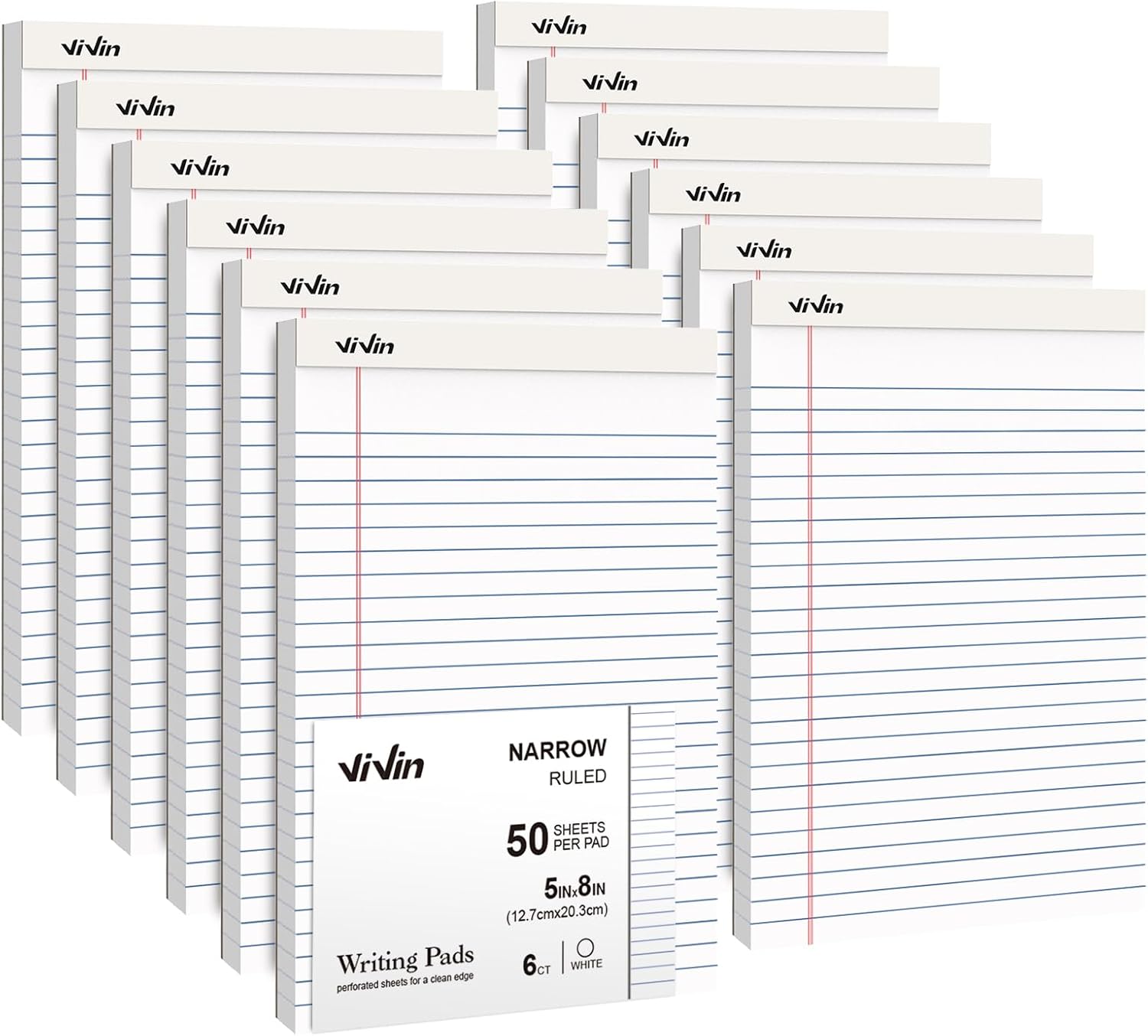 ViVin 5 x 8 Inch Legal Pads, 12 Pack, Narrow Ruled, 50 Sheets Per Writing Pad, Perforated Note Pads Ideal for Home, Office, Business, 600 Sheets, White Paper