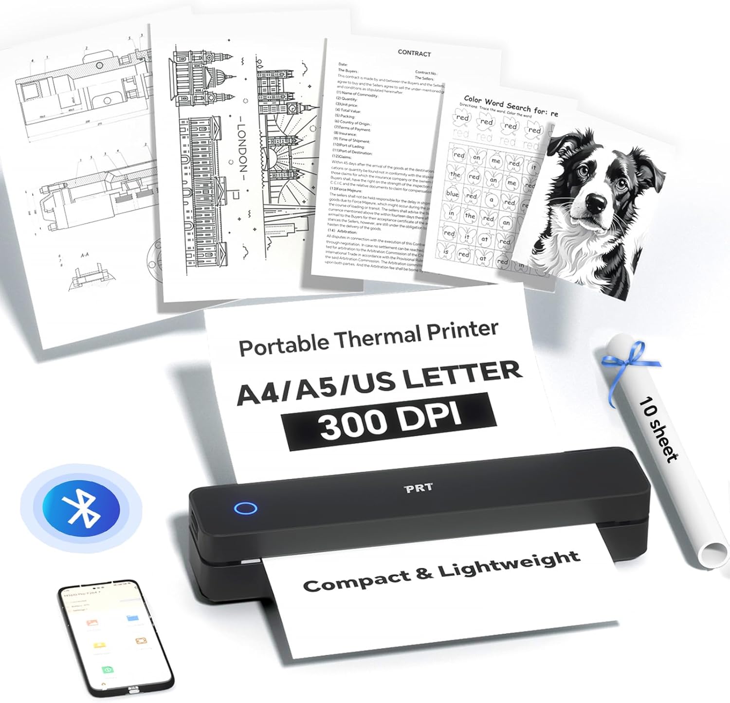 PRT Portable Printer Wireless for Travel, Inkless Bluetooth Small Mobile Thermal Printer, Support 8.5" X 11", A4, Compatible with iOS, Android, Laptop for Home Use, Office & Vehicles, 300 DPI, Black