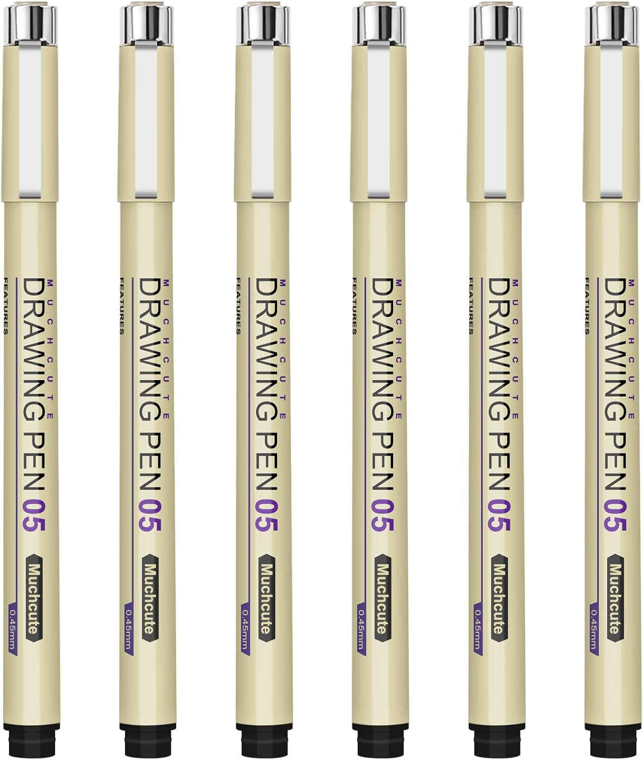 Muchcute 05 Fine Point Writing Pens: 6 Black 0.45mm Thin Micron Pen 05 No Bleed Bible Journaling Study Supplies Annotation Smooth Waterproof Micro Line Needle Tip Fineliner Gel Felt Ink Markers Stuff