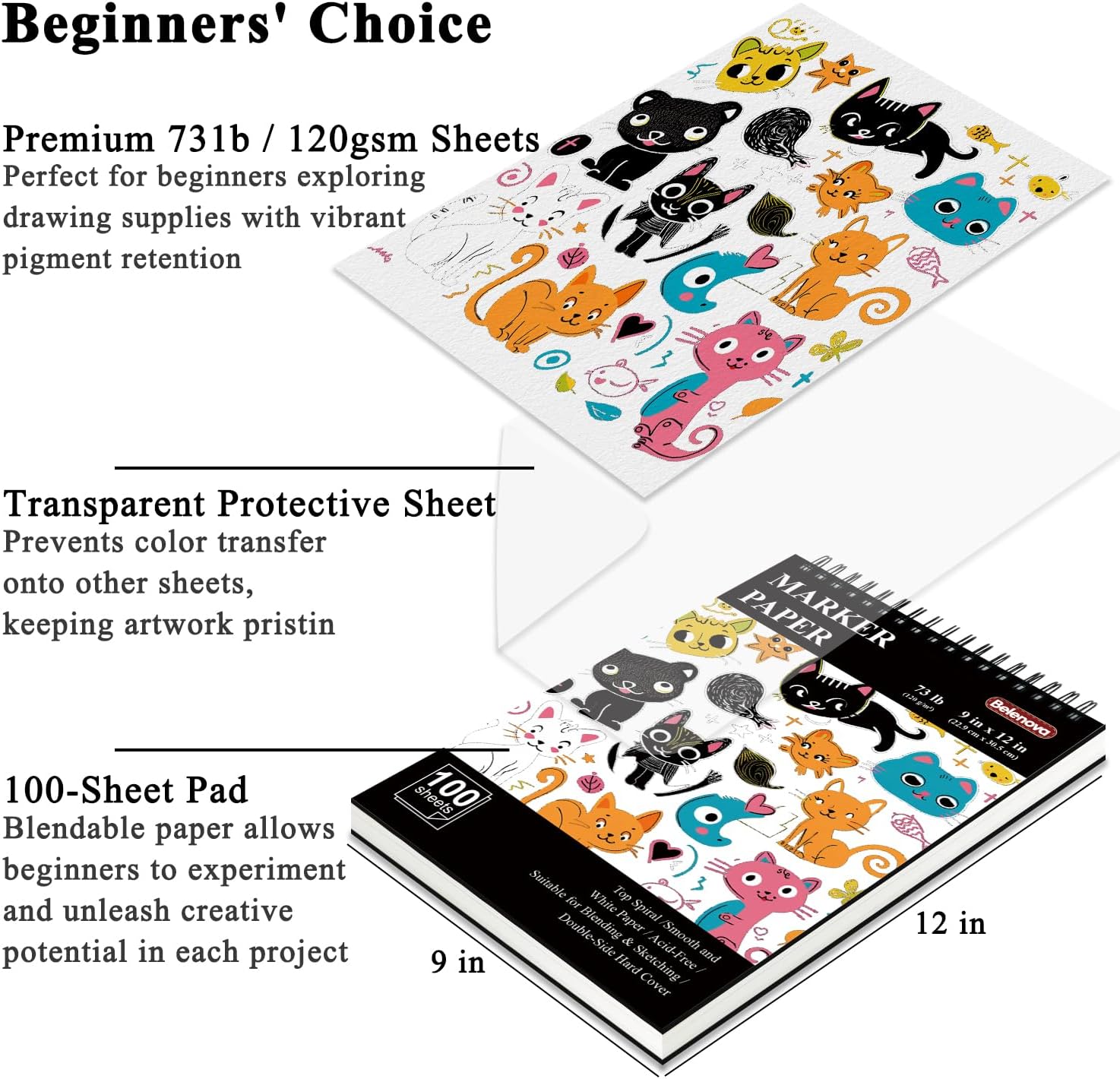 Belenova 9" x 12" Marker Paper Pad, 100 Sheets Bleedproof Sketchbook for Alcohol Markers - 73lb/120gsm Art Supplies for Drawing & Coloring (Kids/Adults).
