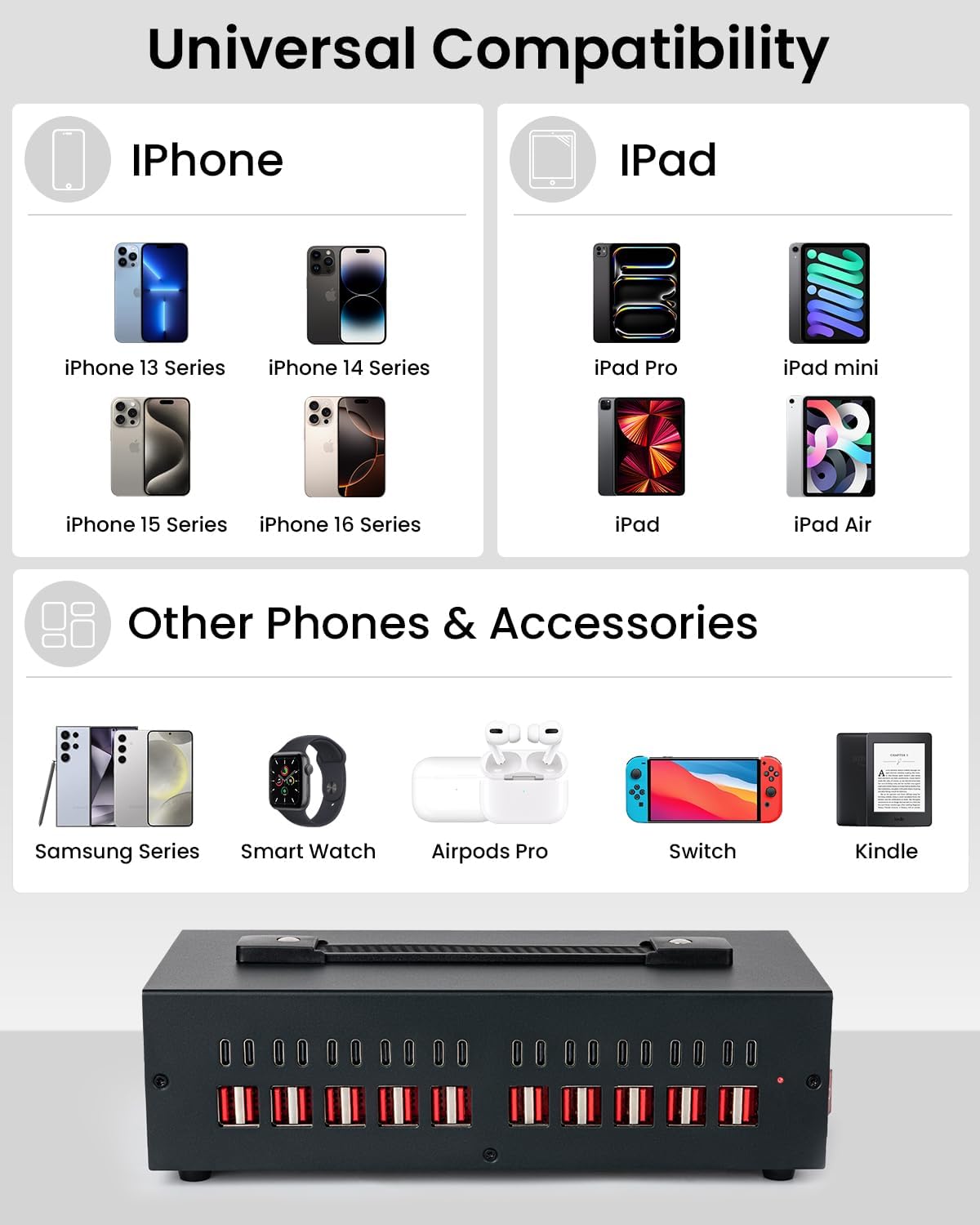 - 40-Port USB~C Charging Station: This USB~C fast charging multi-port charger features 20 USB~C ports and 20 USB A ports, supporting a total output of up to 300W. Multiple usb charger station effortlessly powers up to 40 devices simultaneously, with each port delivering a maximum output of 3A. Perfect for home, office, and travel.