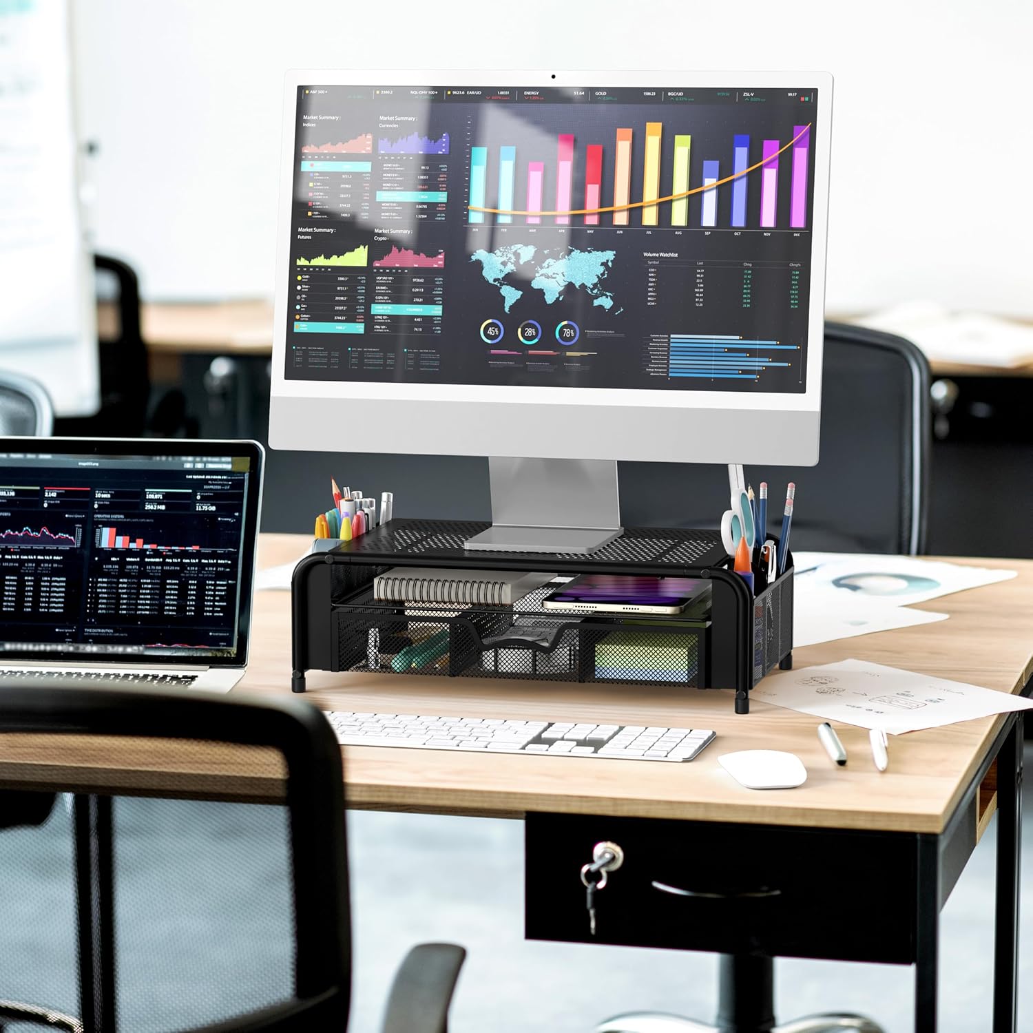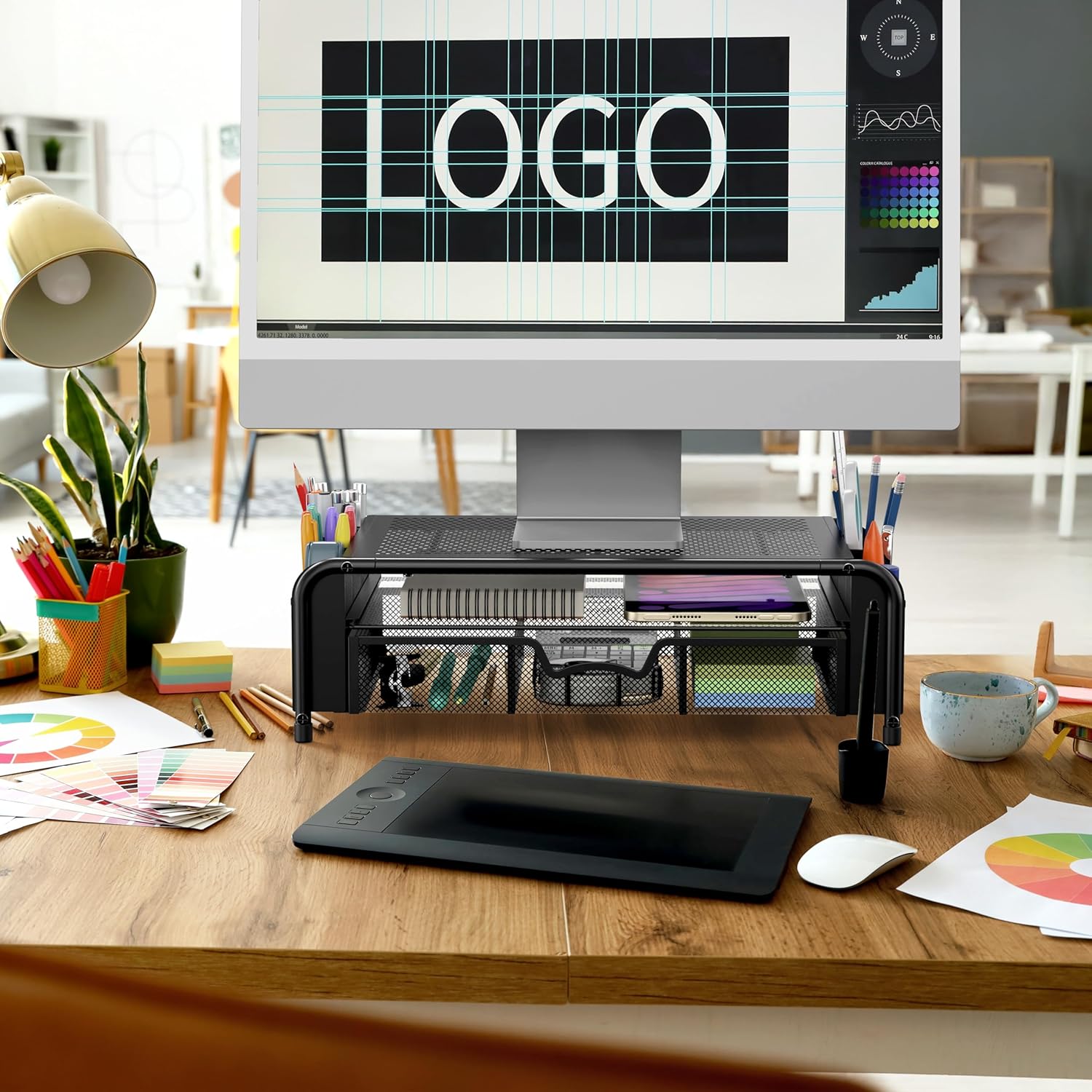 Simple Houseware Monitor Riser Stand with Pull-Out Drawer and Pen Holders, Black