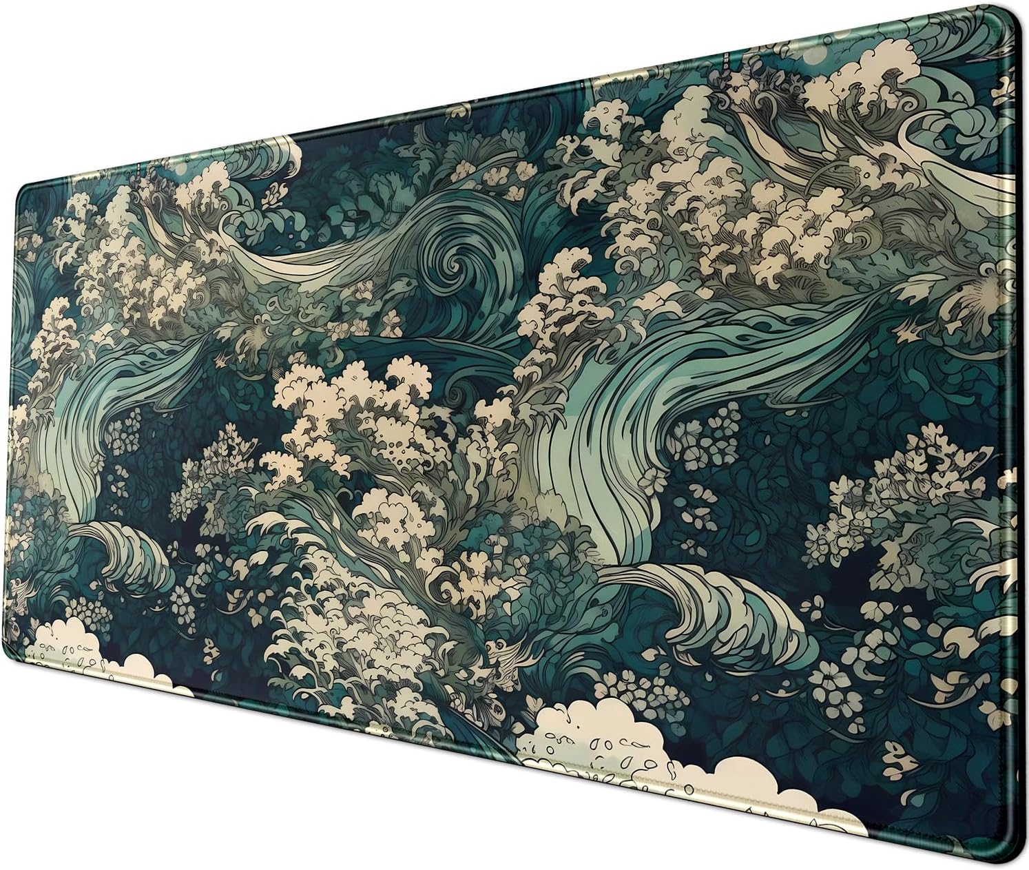 Japanese Large Mouse Pad Gaming Sea Wave Desk Pad Blue Sea Flower Art Aesthetics Desk Pad Non-Slip Rubber Base Mice Pad, 31.5 X 11.8 in for Laptop Computer Mouse Keyboard Mat of Office Desk Decor