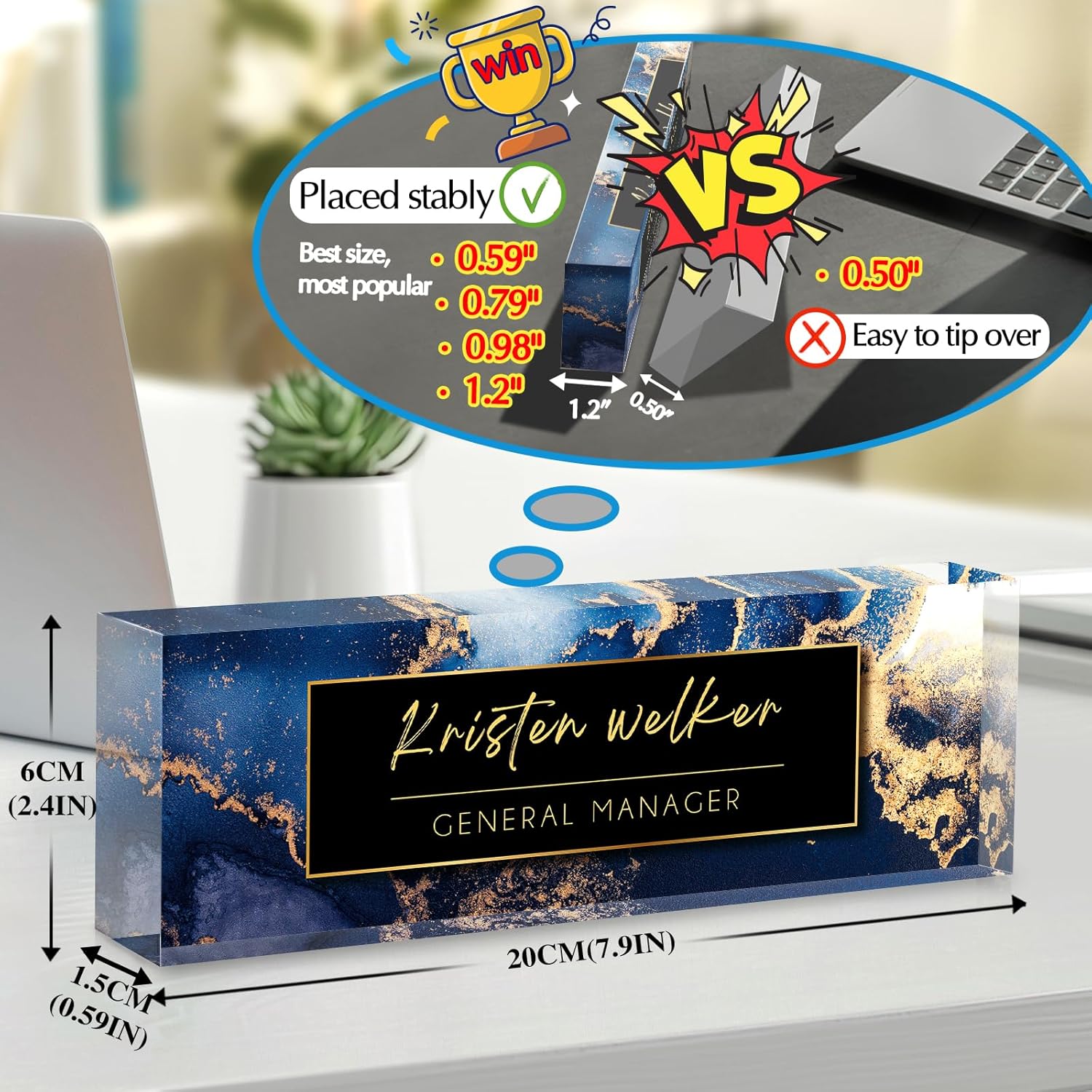 - 【Thickness upgraded to 0.79-1.18 inches】 According to market research, most people who received 0.59-inch thick acrylic nameplates would have problems with instability and easy to tip over, which would bring a terrible shopping experience. From the customer's perspective, we pause Selling a 0.59-inch nameplate, we provide 0.79-inch/0.98-inch/1.18-inch thick acrylic for selection. The 1.18-inch size is the most popular gift size, More fashionable and atmospheric, We aim to bring your vision to life!