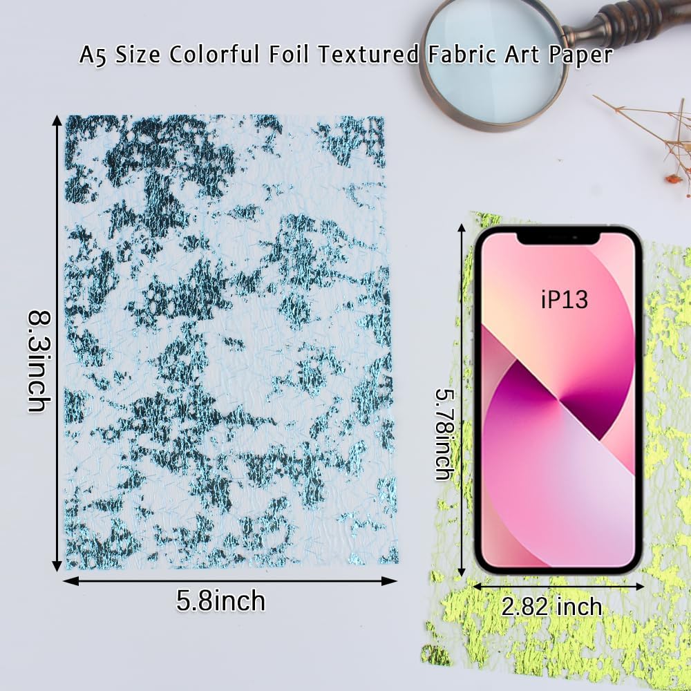 A5 Size Colorful Foil Textured Fabric Art Paper Scrapbooking Decorative, 10 Sheets Sparkle Metallic Lace Mesh for Crafts, Junk Journaling Supplies, Card Making, Collage