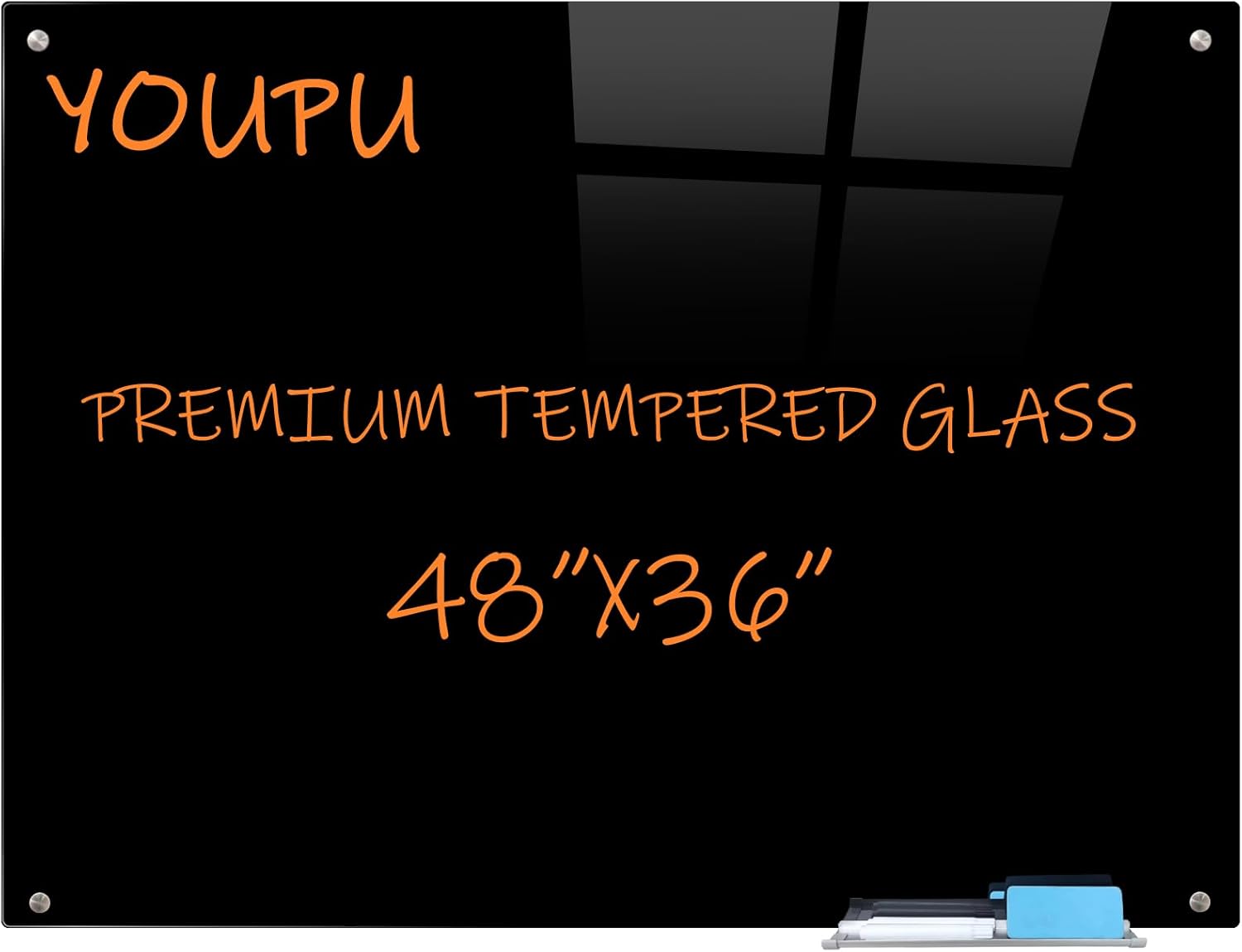 Magnetic Glass Writeboard 48"x36" Premium Tempered Dry Erase Boards Wall Mounted Frameless Whiteboard Bulletin Message Boards (Black)