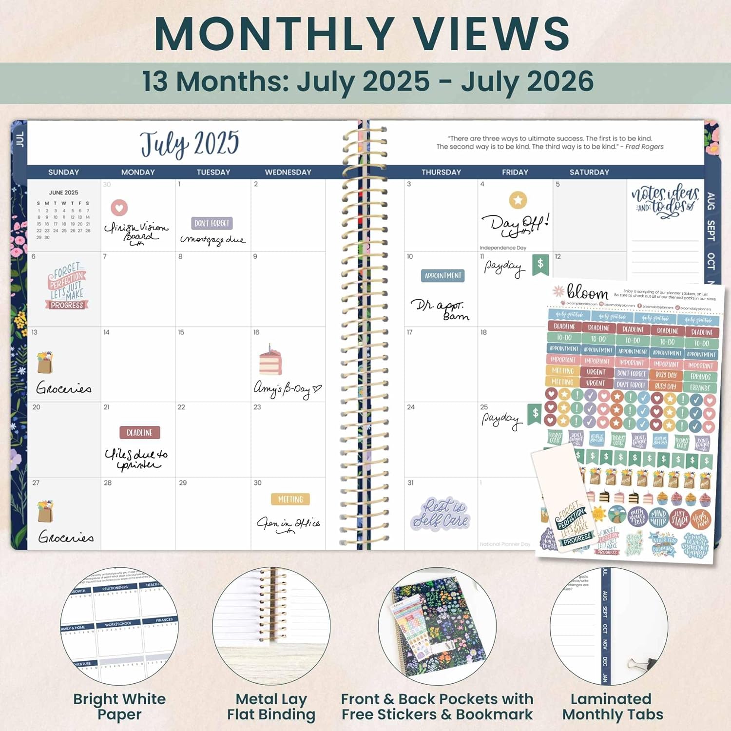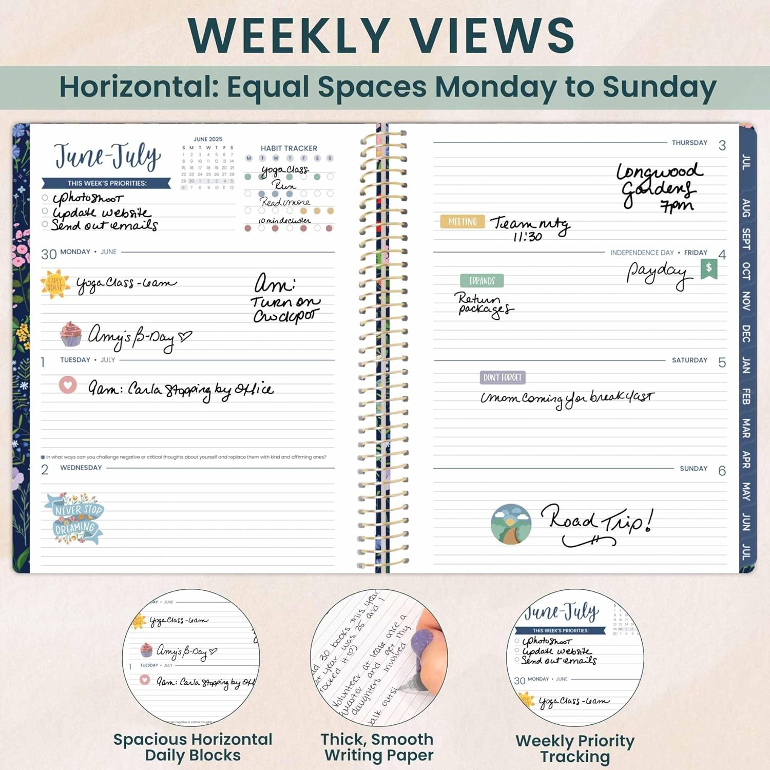 - 8.5β x 11β WITH HORIZONTAL WEEKLY LAYOUT & MONTHLY VIEWS: 2 page monthly overview spreads and spacious weekly views run Academic Year, July 2025 through July 2026. Weekly views are horizontal and include priority & habit tracking.