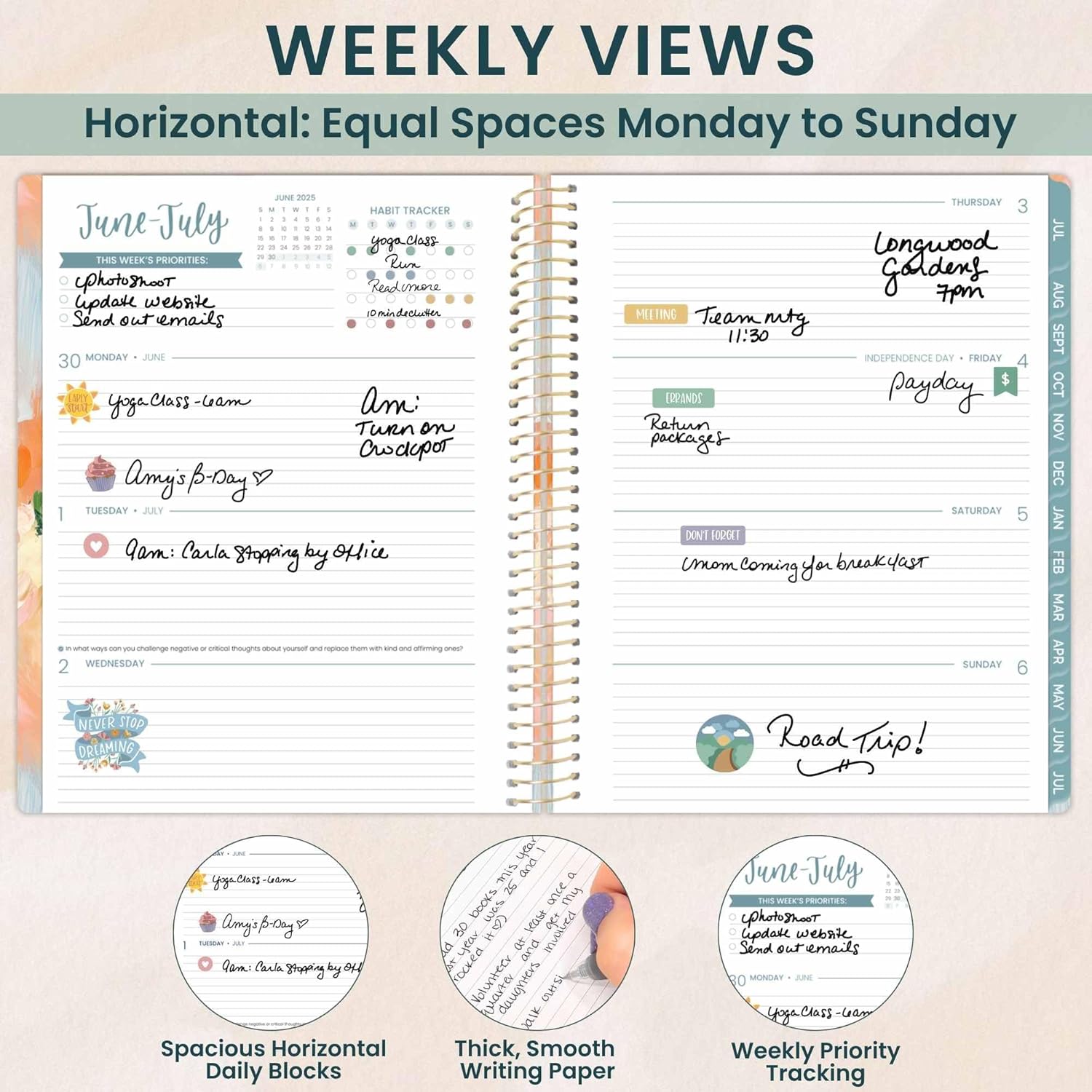 - LARGE 8.5β x 11β PLANNER WITH WEEKLY & MONTHLY LAYOUTS: This 2025-2026 academic planner features two-page monthly spreads and spacious horizontal weekly pages. Each weekly view includes priority & habit trackers to help you stay productive and goal-focused from July 2025 to July 2026.