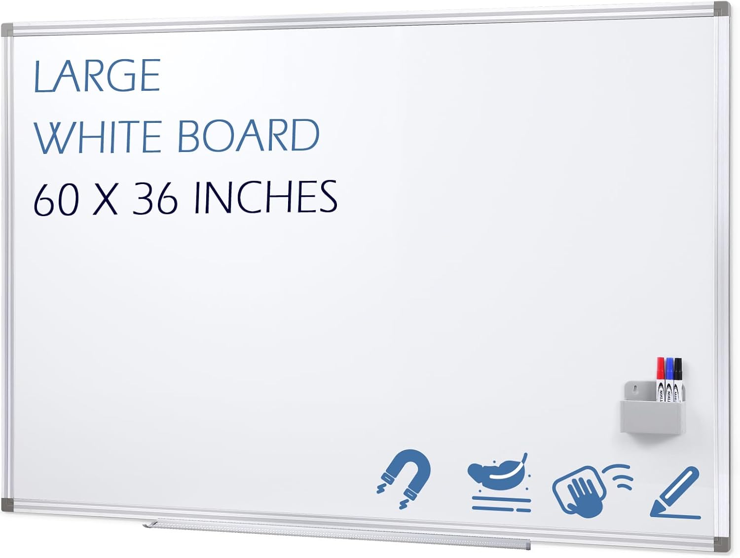 SWANCROWN White Board Dry Erase 60 x 36 Inches, Large Whiteboard for Wall with Thick Aluminum Frame, 5' x 3' Magnetic Whiteboard with Long Marker Tray & Magnetic Pen Holder for Office & Home