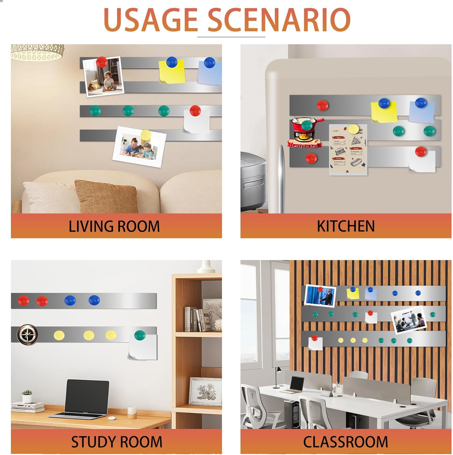 - Premium Material: It consists of three layers: a metal tape, an acrylic adhesive layer and a protective film. Our metal strips can easily attach to magnets, you can use dot magnets to stick memos or important notes for viewing