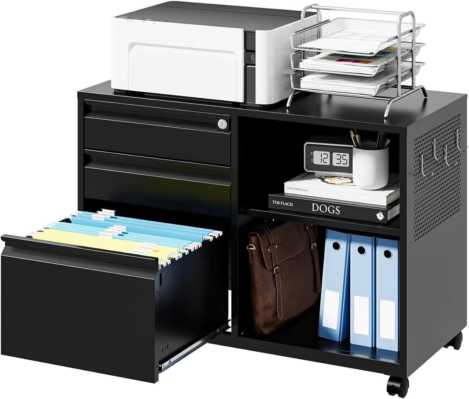 Letaya Mobile 3 Drawer File Cabinet with Lock-Metal Lateral Rolling Printer Stand Filing Cabinets for Home Office-Storage A4/F4/Letter (Black)