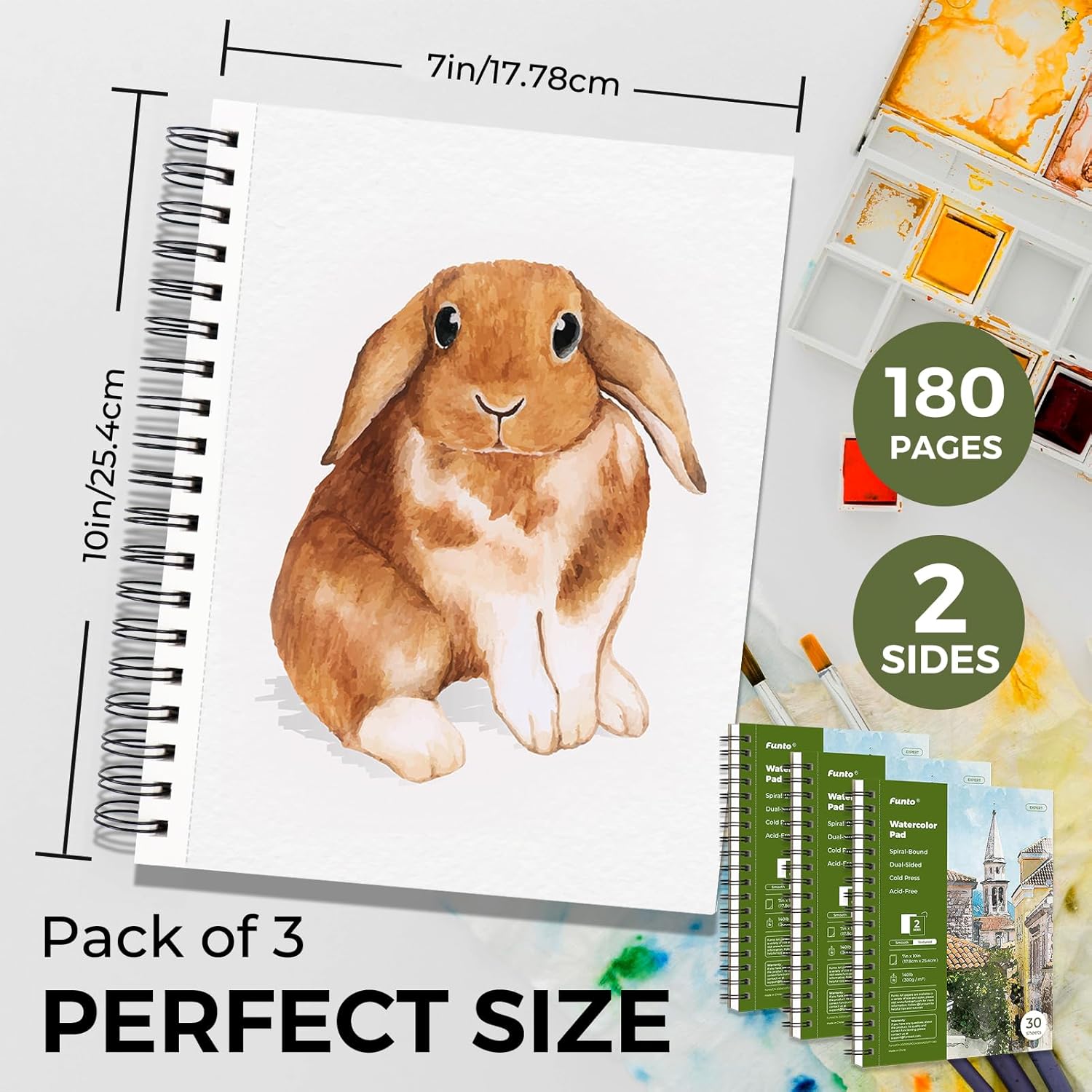 Funto Watercolor Pad 10x7, 3-Pack, 90 Sheets, 140 lb/300 GSM, Double-Sided, Cold Press, Spiral Bound, Heavyweight Paper for Watercolor Painting