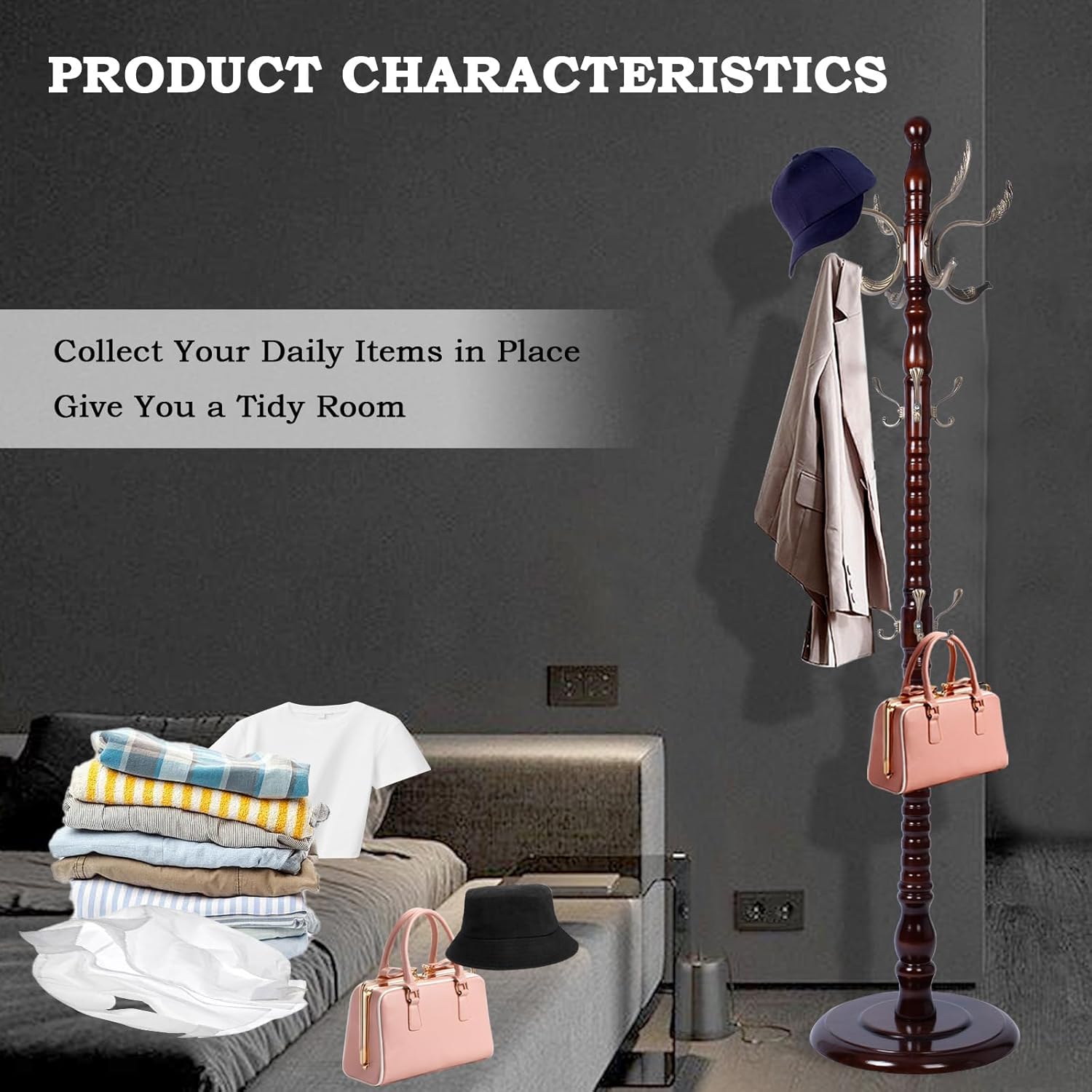 Coat Racks FreeStanding with 14 Hooks, Natural Wood Coat Rack with Solid Round Base, Adjustable Height Coat Racks, Easy Assembly for Hallway, Bedroom and Office (Reddish Brown-Metal Hook)