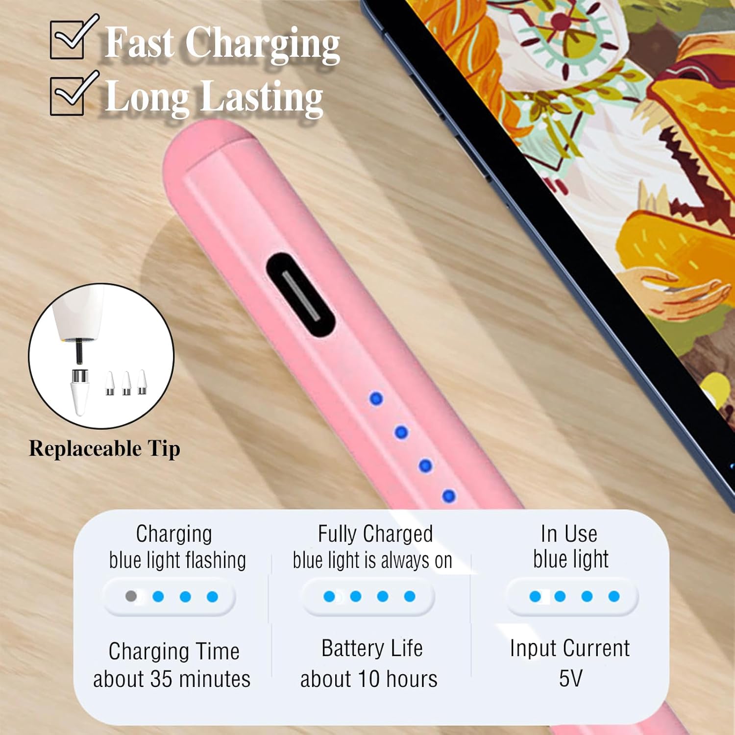 - [Magnetic Adsorption & Fast Charging]- Attached to the iPad side ,keep their lapiz para ipad close at hand and prevent it from getting lost, more portable and more easier to organize.Please note: Devices that support magnetic adsorption function: iPad Pro12.9" (third/fourth/fifth generation); iPad Pro11"; iPad air4; iPad mini6.The pen fully charged in just 35 minutes and provide up to 10 hours of active use on a single charge. Once the indicator light turns on,the ipad pro pencil is active