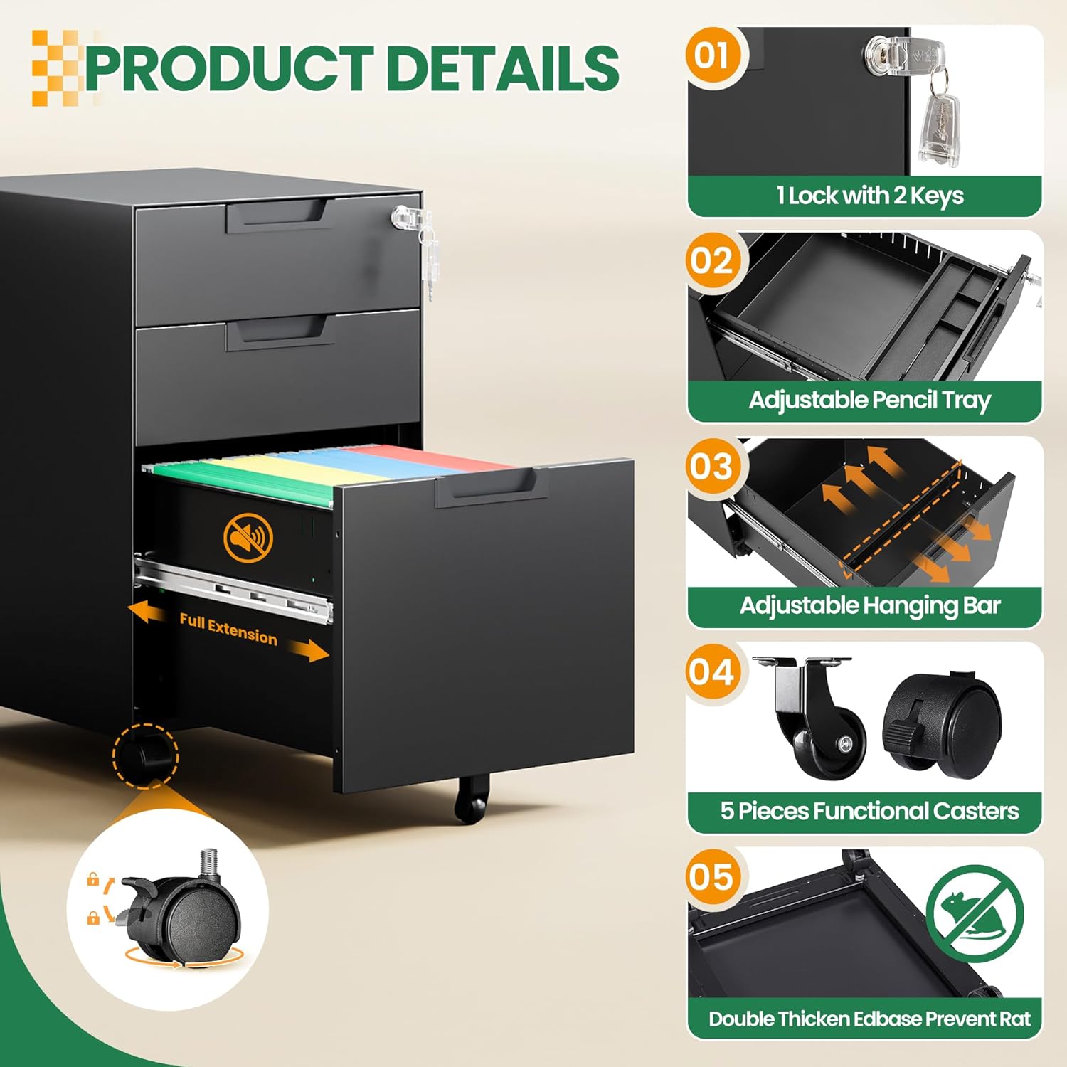 Mobile File Cabinet,3 Drawer Locking Storage Filing Cabinet,Office Metal Storage Cabinet on Wheels for Legal/Letter/A4 File(Fully Assembled,Black)