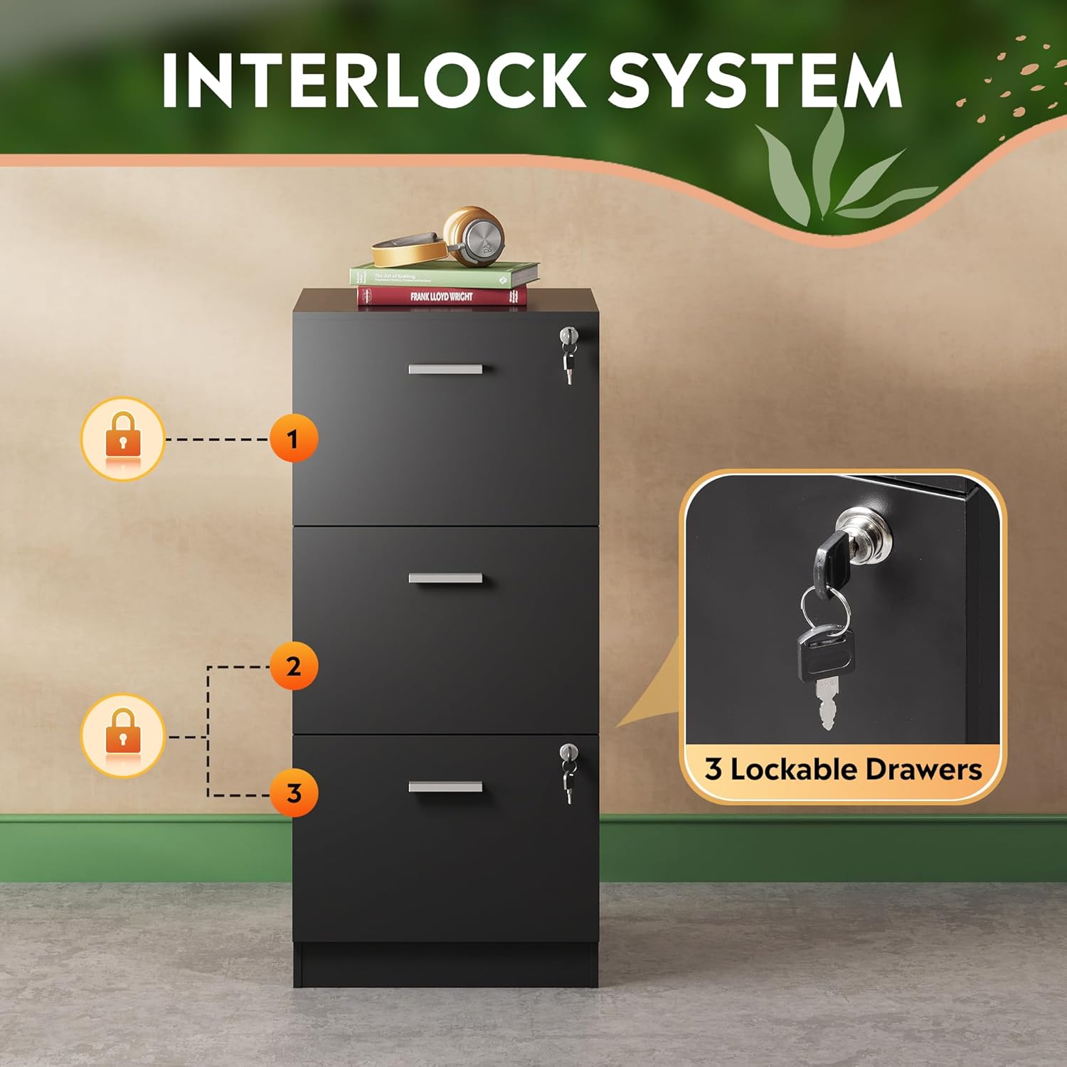 - ăLocking Secure StorageăWith a single lock on the top drawer and a double interlocking structure on the bottom, this file cabinet ensures secure locking for all drawers, ideal for storing important documents and personal items, safeguarding your privacy and security.
