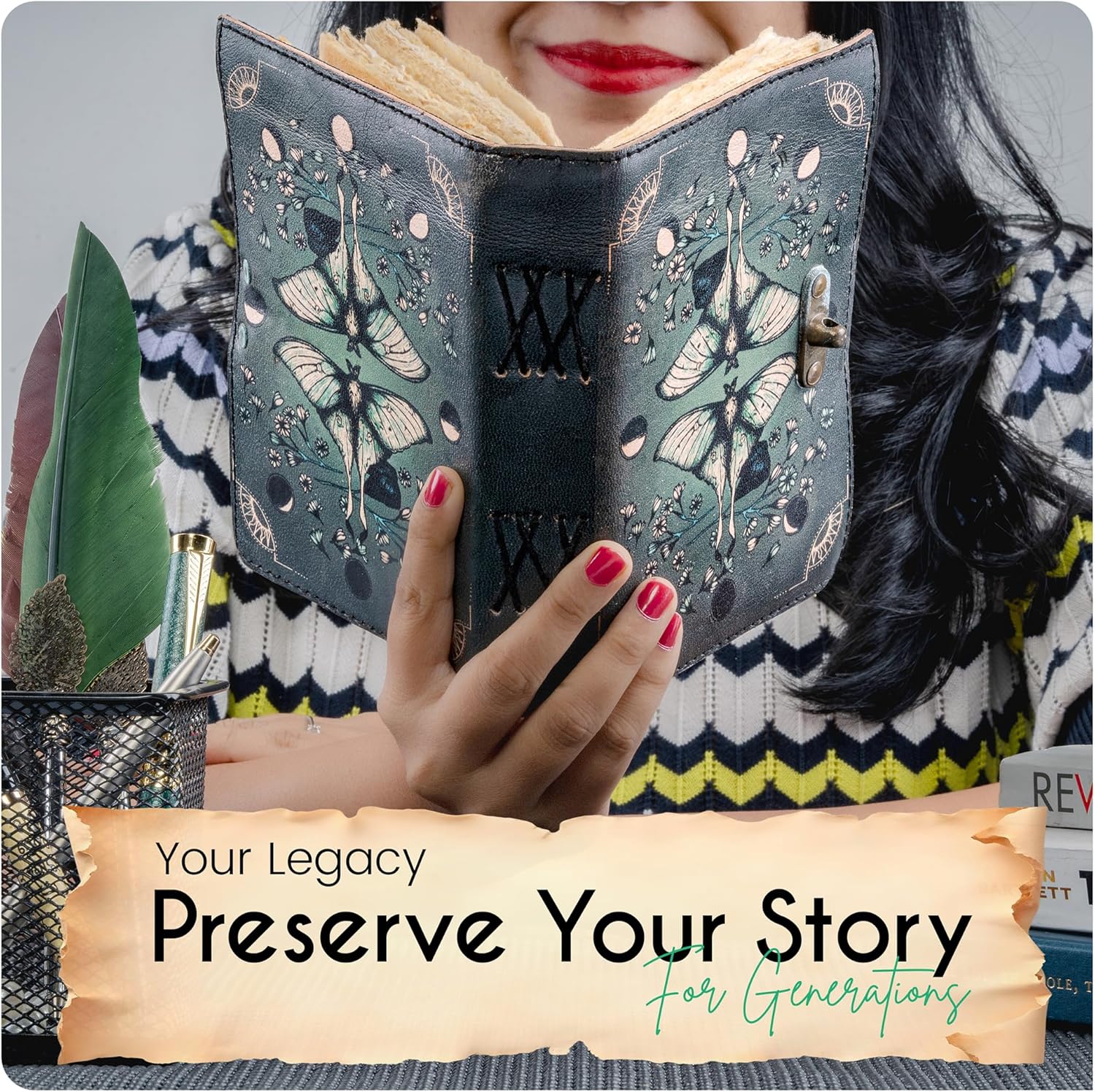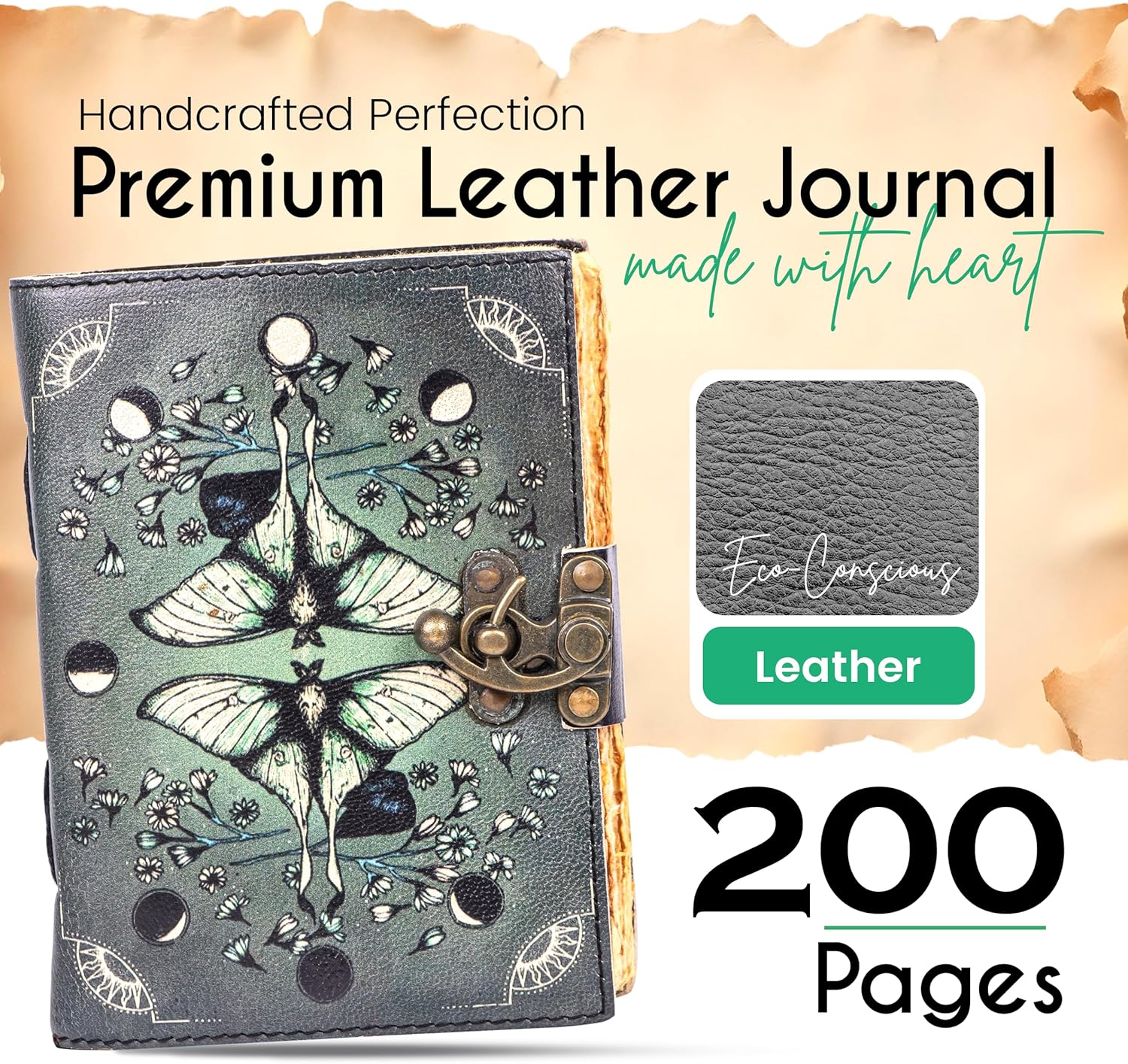 Blank Spell Book of Shadows Leather Journal Diary β Luna Moths and Morpho Butterfly Bound Journal with Clasp Lock β 200 Page Deckle Edge Vintage Notebook for Writing, Home, Office, Travelling