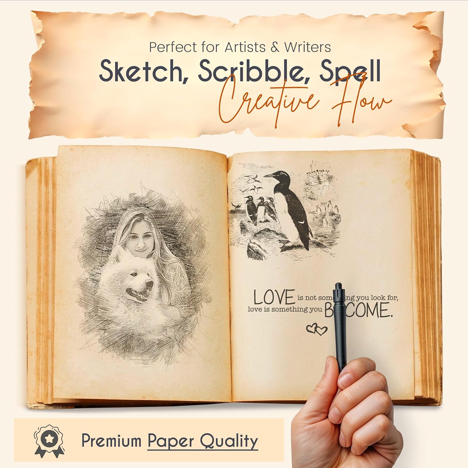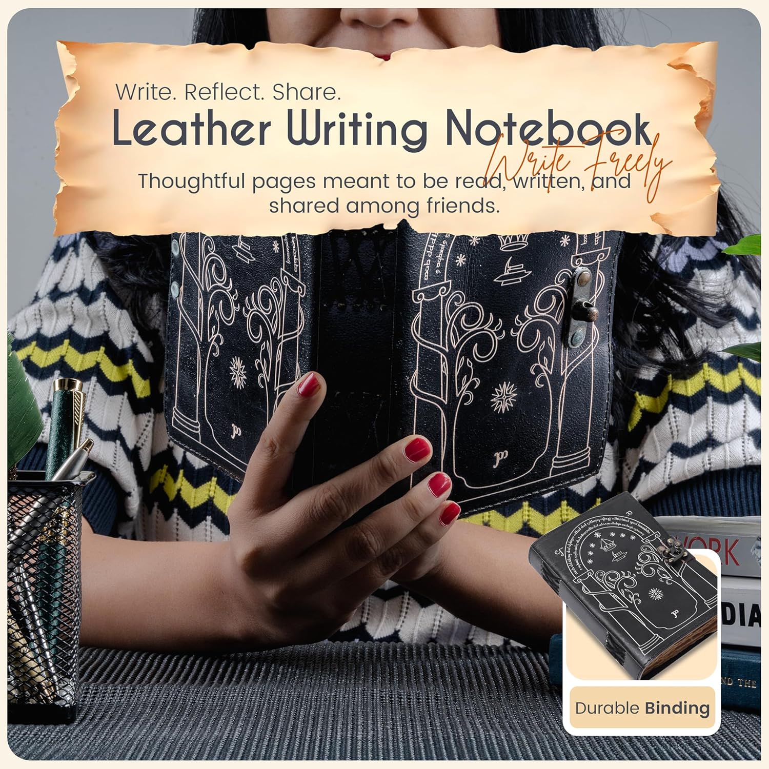 - ππ’π§π§π’π‘ π§ππ₯πππ πππ‘πππ‘π: Expertly hand-stitched with durable cotton thread, this handmade leather bound journal ensures all 200 antique deckle-edge pages remain intact. Its robust binding makes it a dependable blank leather journal for daily writing, sketching, or artistic projects that require a sturdy, lasting notebook.