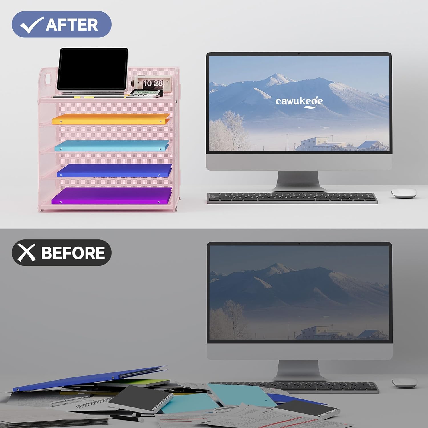 - 【EFFICIENT DESK ORGANIZER】Keep your desk tidy and clutter-free with our 5-Tier Paper Organizer with Handle. This file organizer provides ample space for sorting and storing papers, letters, documents, folders, books, magzines, staplers, caculators and sticky notes.