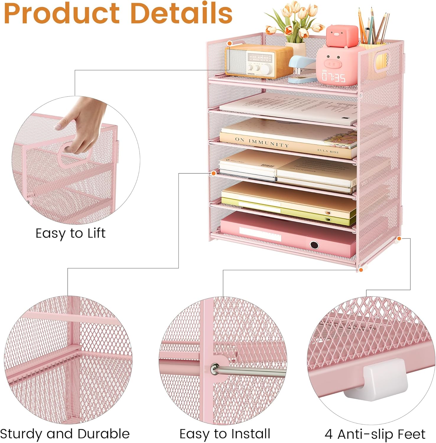 Subekyu 6 Tier Office File Paper Desk Tray Organizer with Handle, Stackable Slide Mesh Letter Tray Folder Pink Desk Organizer, Desktop Document Sorter for Classroom, Office, Home Supplies Storage
