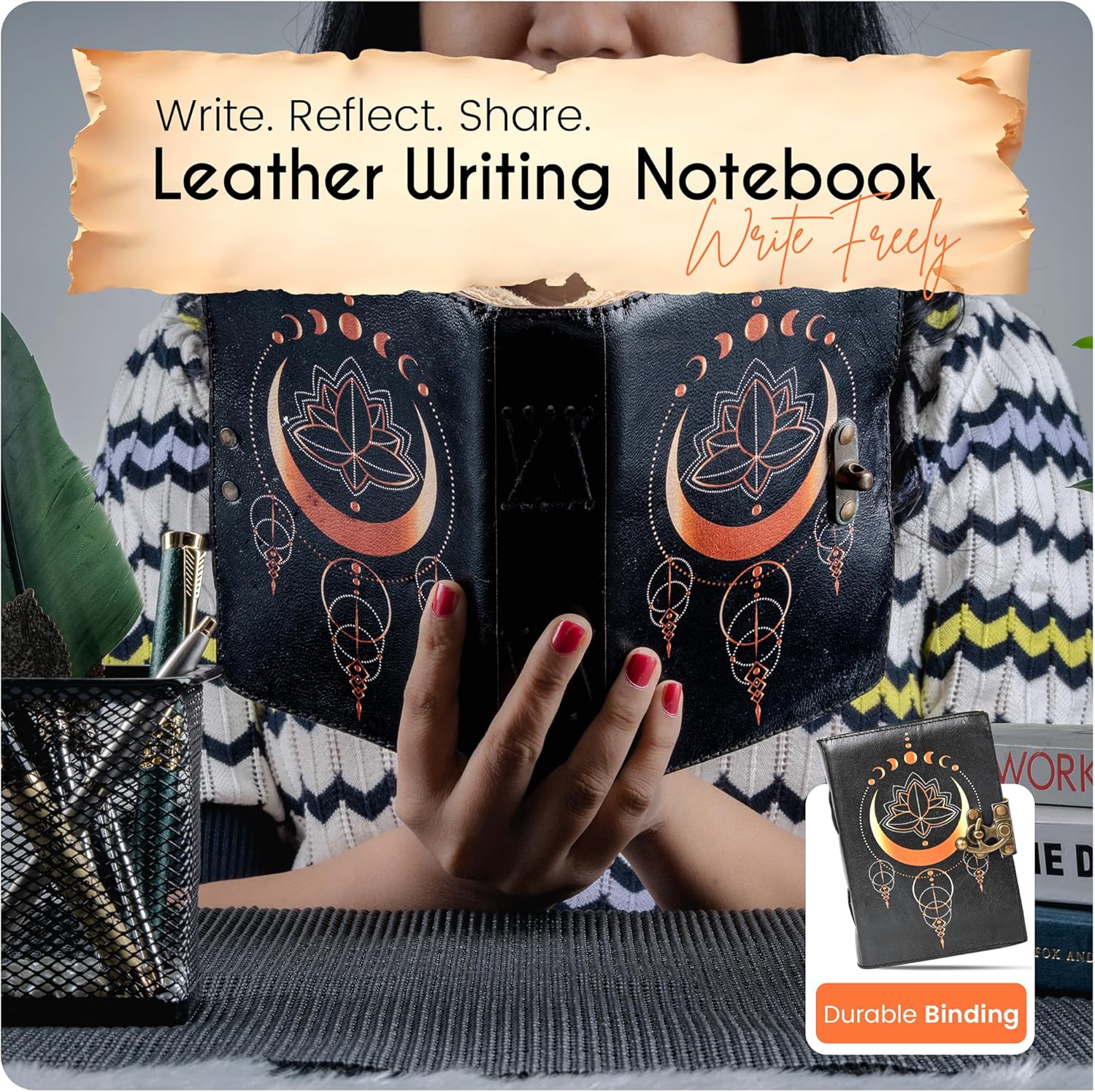- π¨π‘ππ€π¨π ππ₯ππ¦πππ‘π§ π π’π’π‘ πππ¦πππ‘: This large leather journal features a beautiful crescent moon design, symbolizing new beginnings, intuition, and inner wisdom. A meaningful leather diary for those who enjoy spiritual reflection, writing, or daily journaling with a deeper connection.