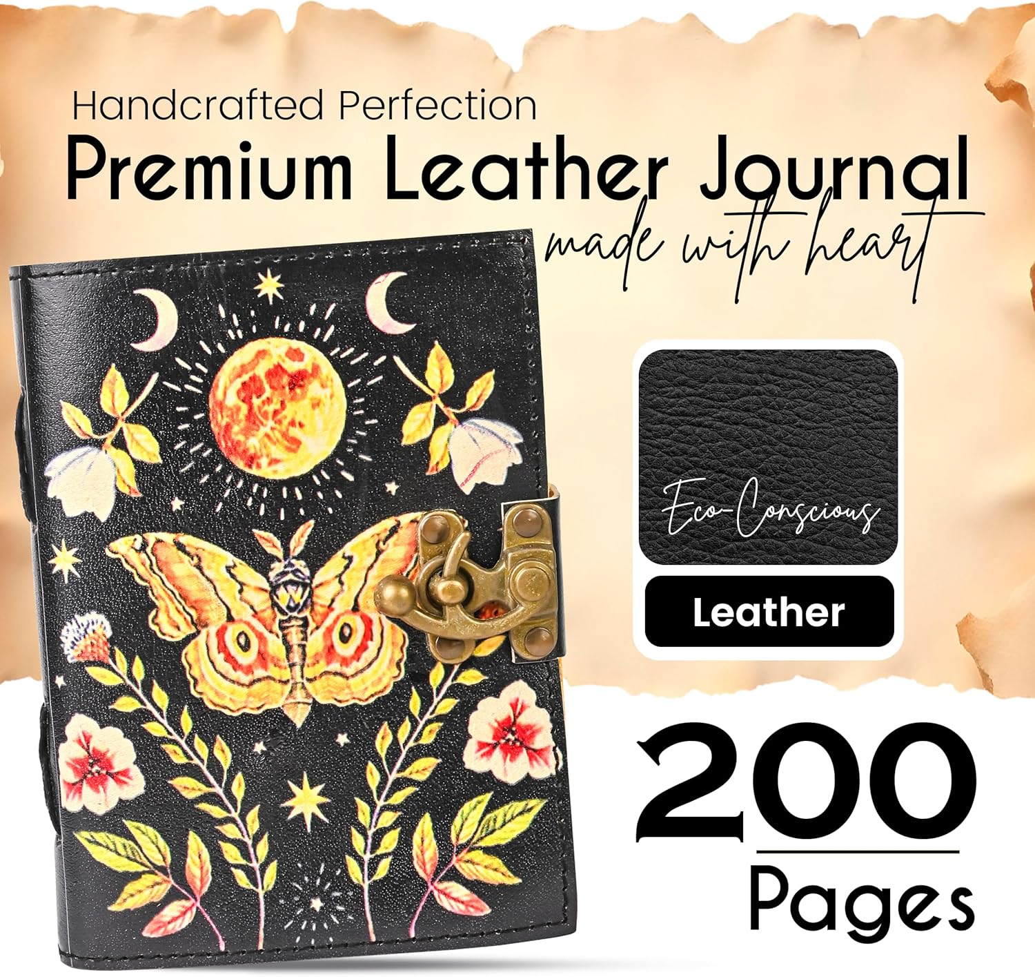 Blank Spell Book of Shadows, Luna Moth & Butterfly Leather Journal with Vintage Clasp Lock β 200 Page Antique Deckle Edge Leather Bound Notebook β Notebook Journal Gift for Men & Women