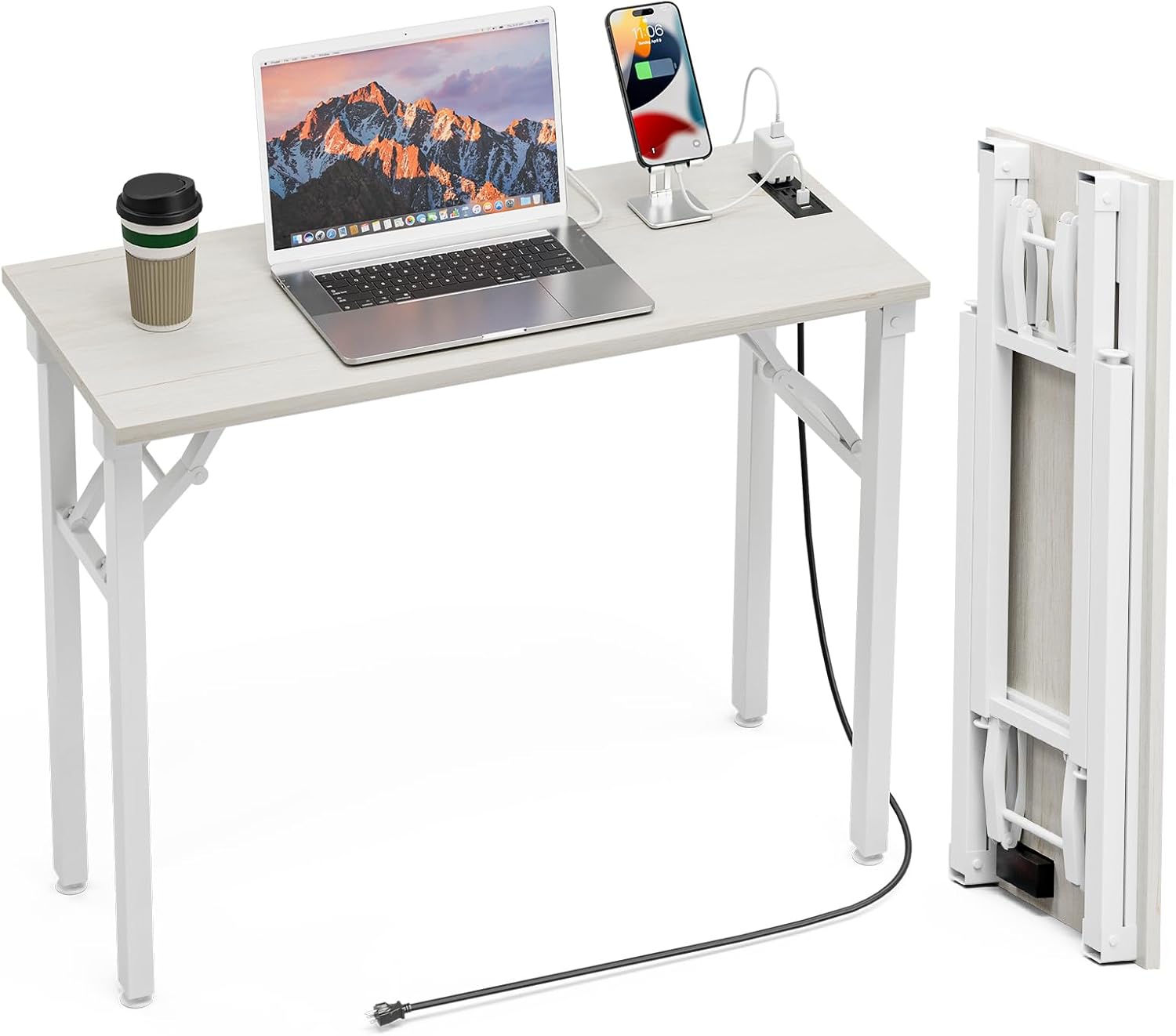TEMI Small Computer Desk Folding Table - No Assembly, Compact 35.8" Foldable Desk with Power Outlets & USB Charging Port, Portable Small Office Desk, Ideal Mini Study Table for Narrow Spaces,White Ash