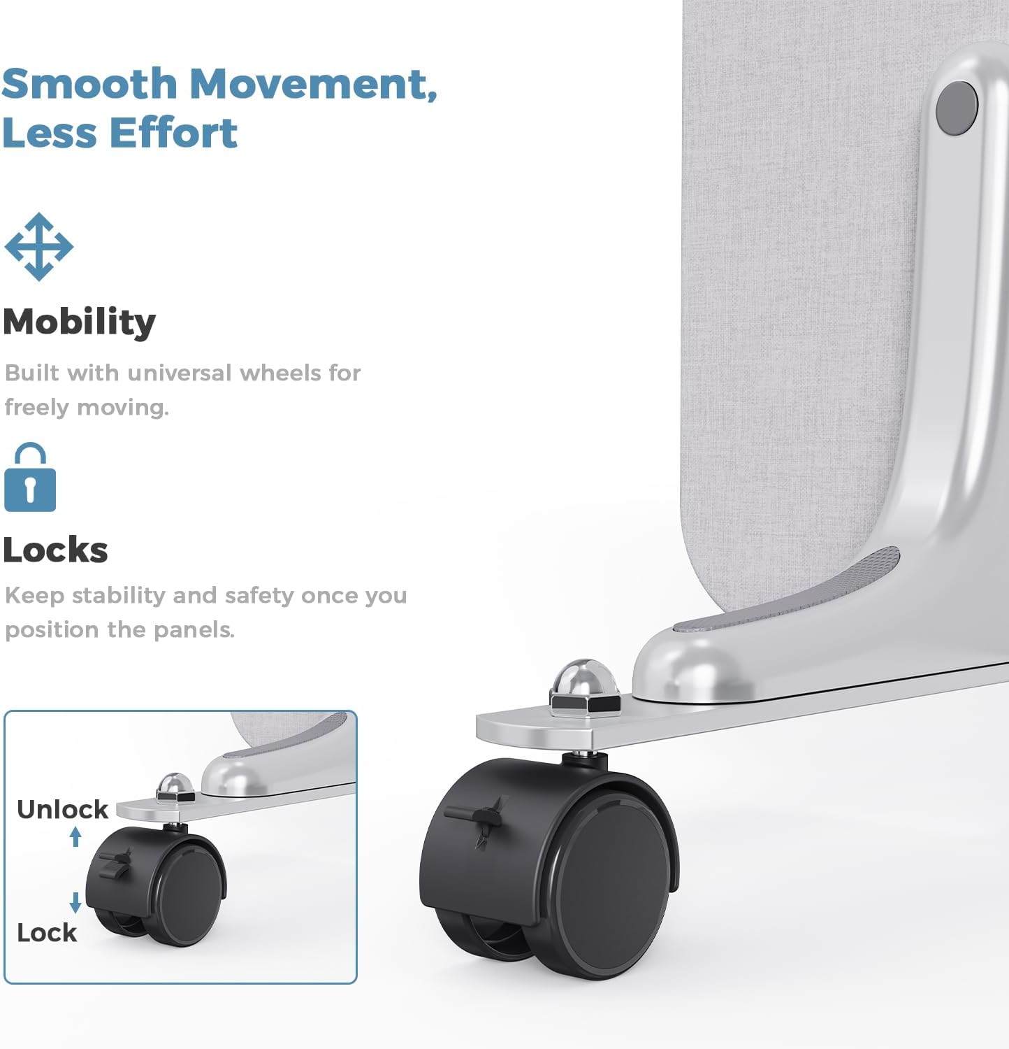 - Smoothly Mobility: Mobility is key in dynamic work environments, and our partition walls are equipped with 12 self-locking universal wheels that make repositioning a breeze. Once you have the partitions in the desired position, simply engage the locking mechanism to secure them in place, ensuring stability and safety. This feature is particularly beneficial for flexible workspaces, allowing you to easily reconfigure your layout for various activities and events.