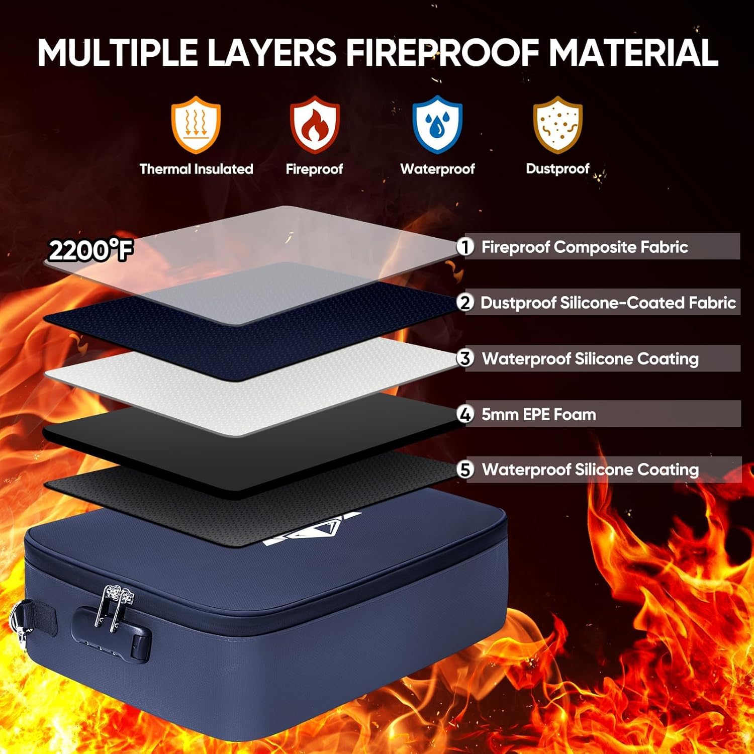 - Fireproof and Waterproof: The fireproof document box /bag is made of dust-proof silicone fiberglass, offering fire resistance up to 2192β, SGS-certified (UL94 VTM-0); Its waterproof design protects your documents from rain and spills (No folders included)