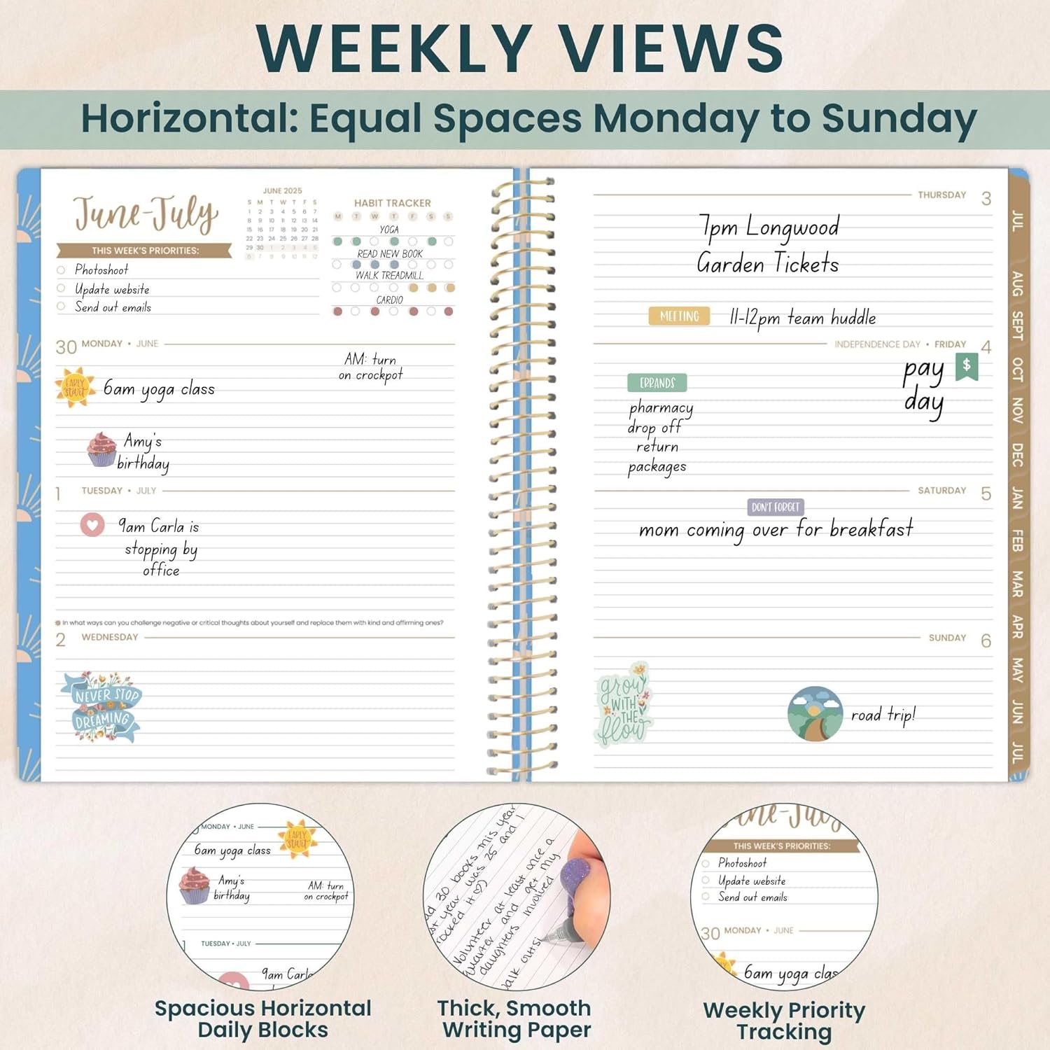 - DIMENSIONS & LAYOUT: 8.5" wide x 11" tall. 2 page monthly overview spreads and spacious weekly views run Academic Year, July 2025 through July 2026 -- 365+ days of planning! Weekly views are horizontal and include priority & habit tracking