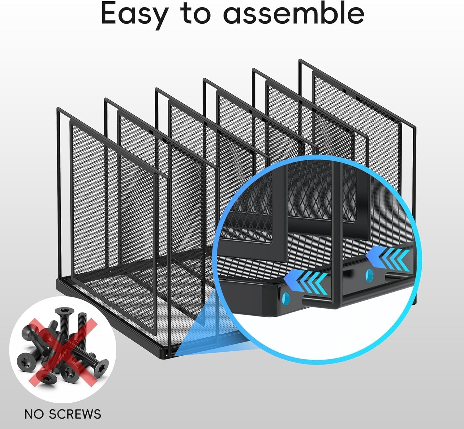 - [Easy to Assemble] No screws, no screwdriver! Just pull the desk organizer out of the box, thread the hook of this file sorter into the holes. Then you can get a desktop file organization much safer and easier.