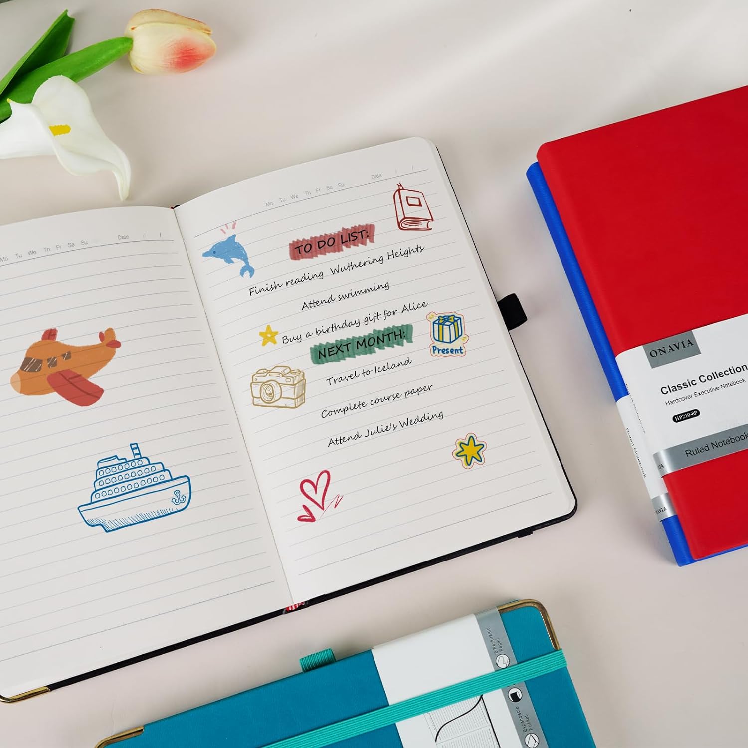 - Bright & Bold Colors: Our notebook journals for women & men are designed with 4 colors-Black, Red, Klein Blue, Pacific Green. The size of the notebooks for work is 5.5" x 8.3", portable. A5 travel journal fits for note taking, life scheduling, journaling, teaching and studying. Great journal notebook for business work, college, travel, school, office and home. This makes for an exceptionally special and perfect gift to share with your friends and family