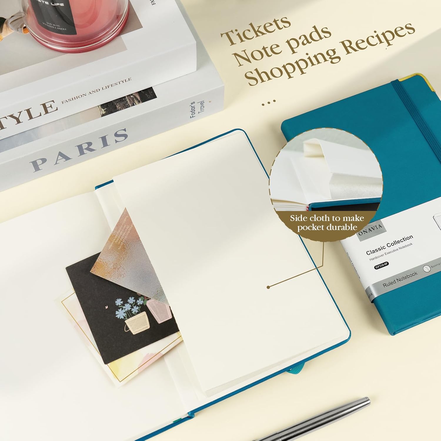 - Humanity Detail Design: A5 Hardcover Journal Note Books feature an elastic pen loop, making it more convenient to carry pens of various sizes. The elastic closure band let the hardcover notebook open and close freely. 1 Expandable inner pocket can easily store notes, bills, receipts, appointment cards, and more. And 1 ribbon bookmark helps quickly find the correct page