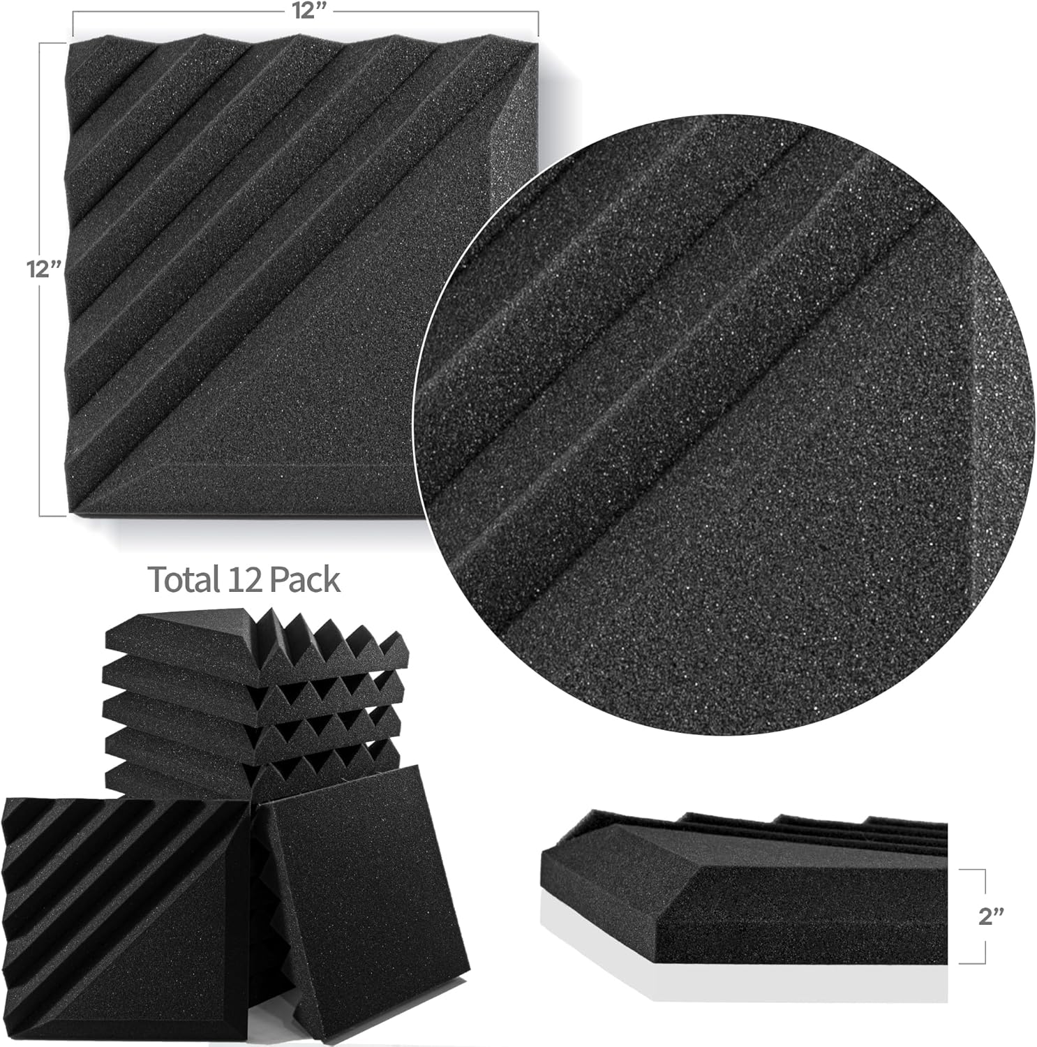 12 Pack Sound Proof Foam Panels for Walls, 12x12x2 Inches Half-Slash Style Acoustic Panels for Home Studio Acoustic Treatment (Black)