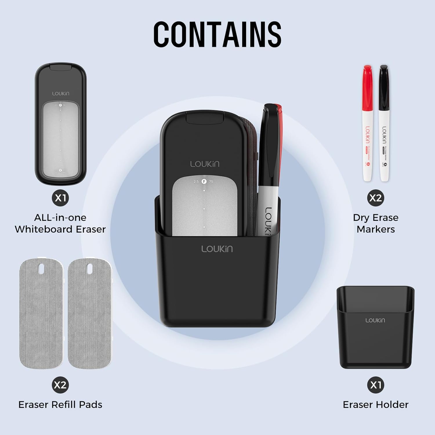 loukin Inventive All-in-One Dry Erase Eraser, Novel Replaceable Whiteboard Eraser with Built-in Cleaner, Unique Glass Board Erasers, Includes 2 Refill Pads, 1 Magnetic Holder, 2 Markers